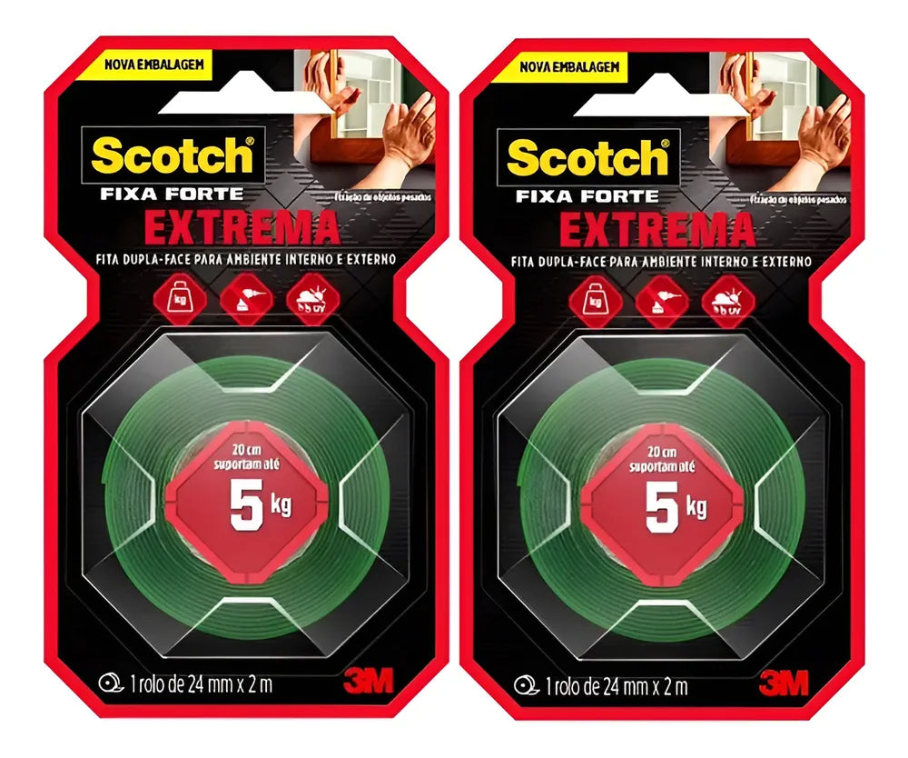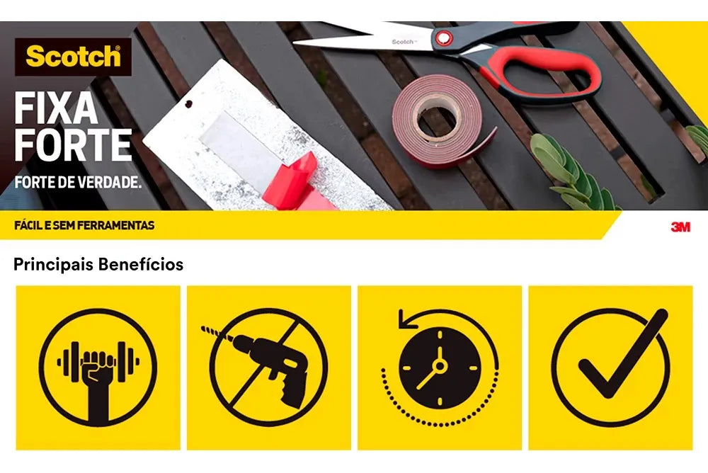 A Fita Dupla Face 3M Scotch Fixa Forte Fixação Extrema proporciona fixação permanente de qualidade profissional com pouca quantidade de fita. Sua aplicação limpa e sem barulho dispensa o uso de pregos e parafusos. É perfeita para fixação de objetos pesados em qualquer superfície lisa, como paredes, acrílicos, vidros, plásticos, metais, madeiras com verniz ou pintadas e revestimentos (que não recebam umidade), em ambientes internos e externos. Resiste às variações de temperatura e clima. Não amarela com o passar do tempo.Fita Dulpa Face Espuma Fixa Forte 24mmx2m 3m Scotch - 5kg