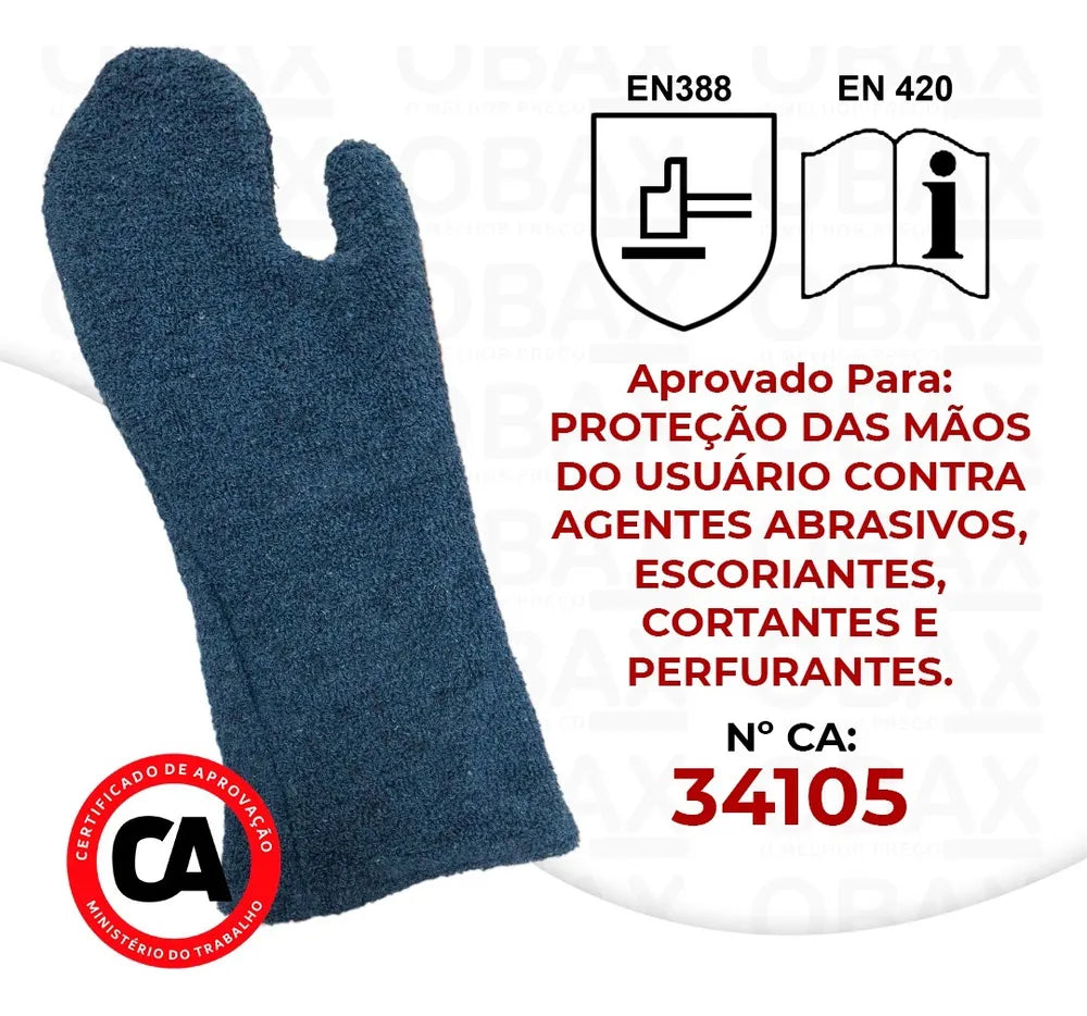 Luva de segurança confeccionada em Grafatex de algodão quatro fios com tratamento retardante a chamas e repelente à água. Costura em linha de poliéster. Modelo Mão de gato