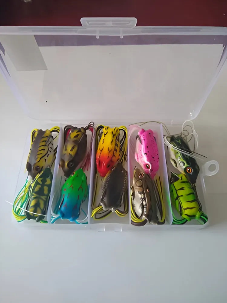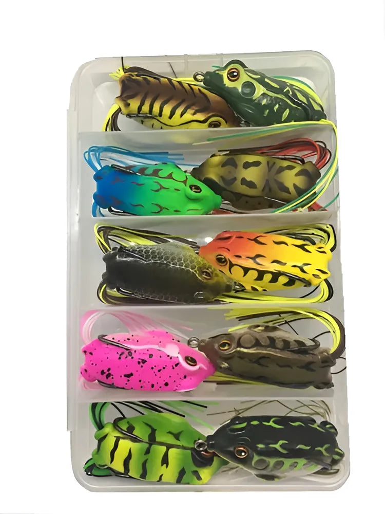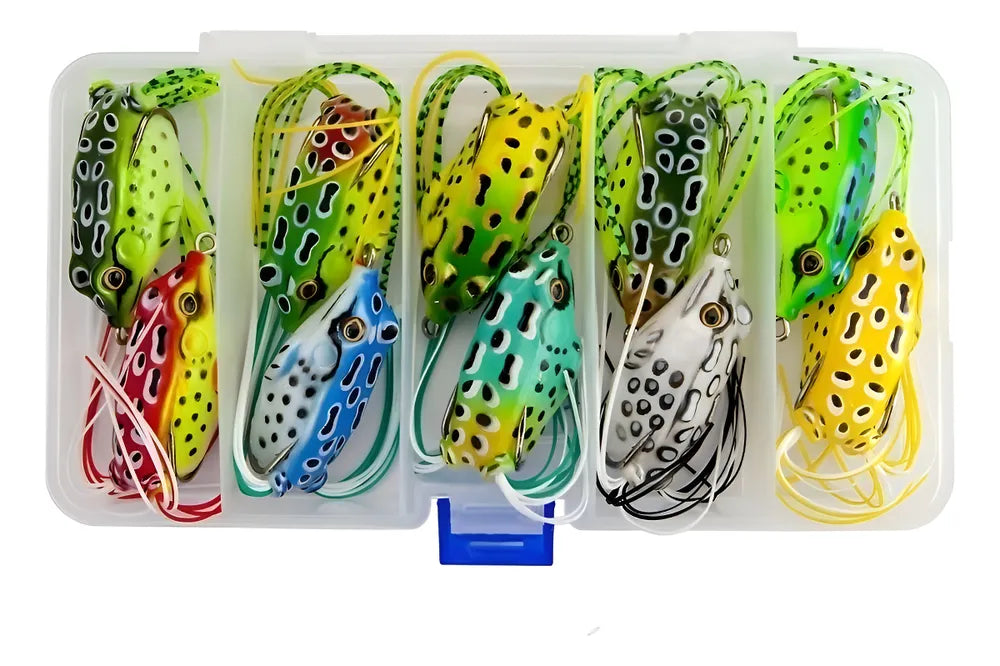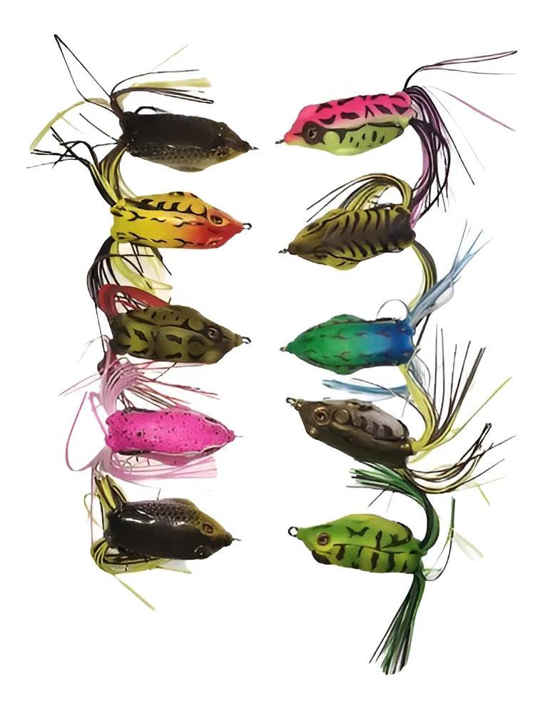 * 10 UNIDADES DE ISCA ARTIFICIAL SAPO FROG ANTI ENROSCO DE 3,5 A 5,5 cm DE COR ALEATÓRIA E 01 ESTOJO.