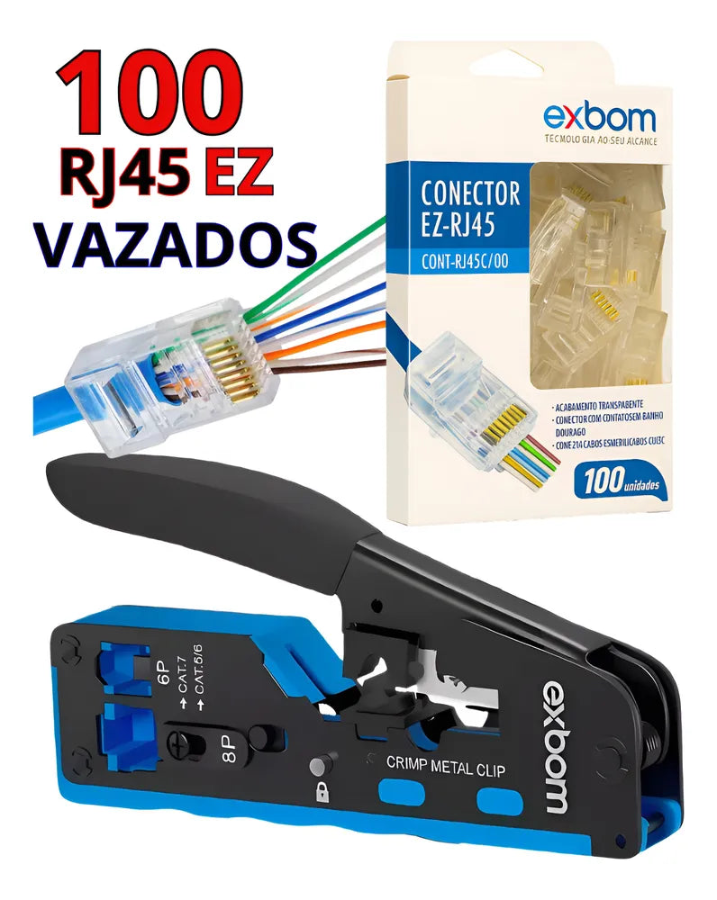 ALICATE DE CRIMPAGEM PROFISSIONAL + 100 CONECTORES RJ45 EZ VAZADOS CAT5E / CAT6