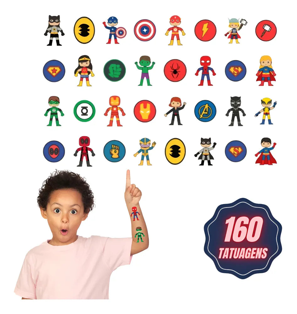 O Kit de Tatuagem Temporária Infantil Fácil de Usar da Tatuagem Mania é uma maneira divertida e segura de permitir que seu filho expresse sua criatividade e amor pelos super-heróis. Compre hoje e veja o sorriso no rosto do seu filho ao se transformar em seu herói favorito.