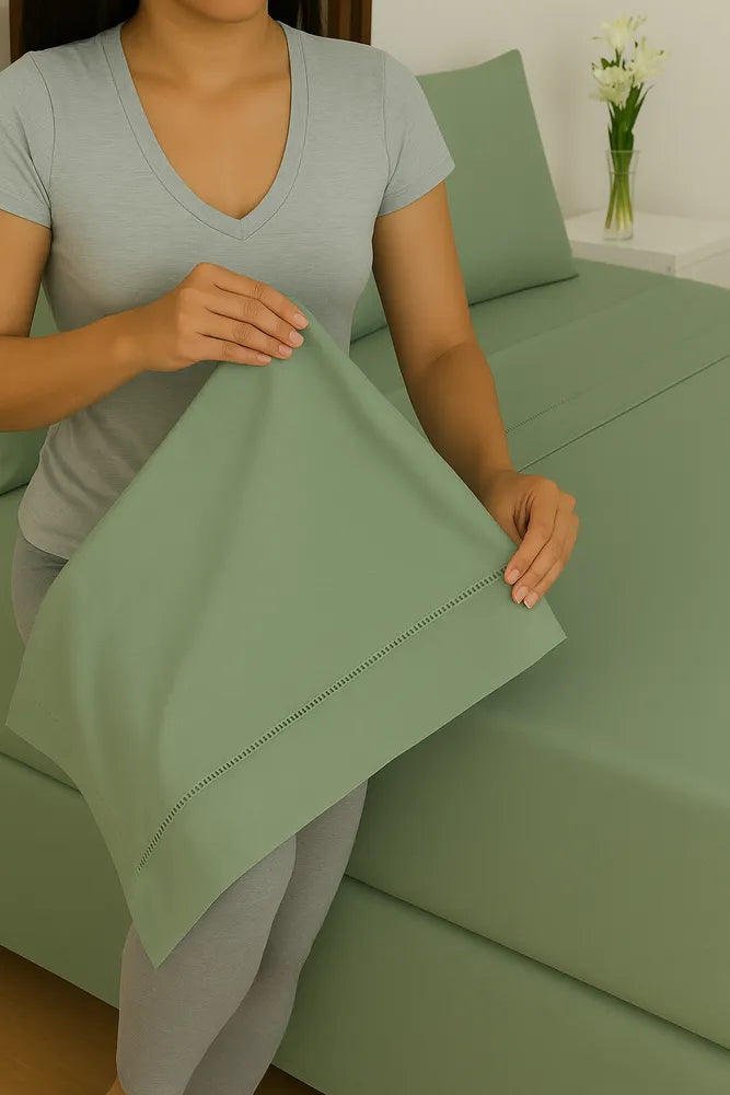 Acabamos em branco, mas reforço em linha preta. Ótima aba interna para segurar o travesseiro. Tecido de ótima qualidade.