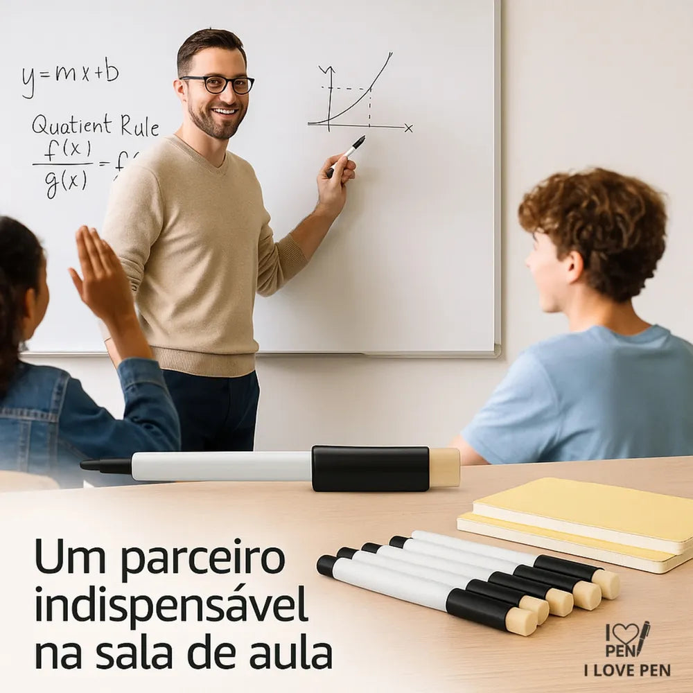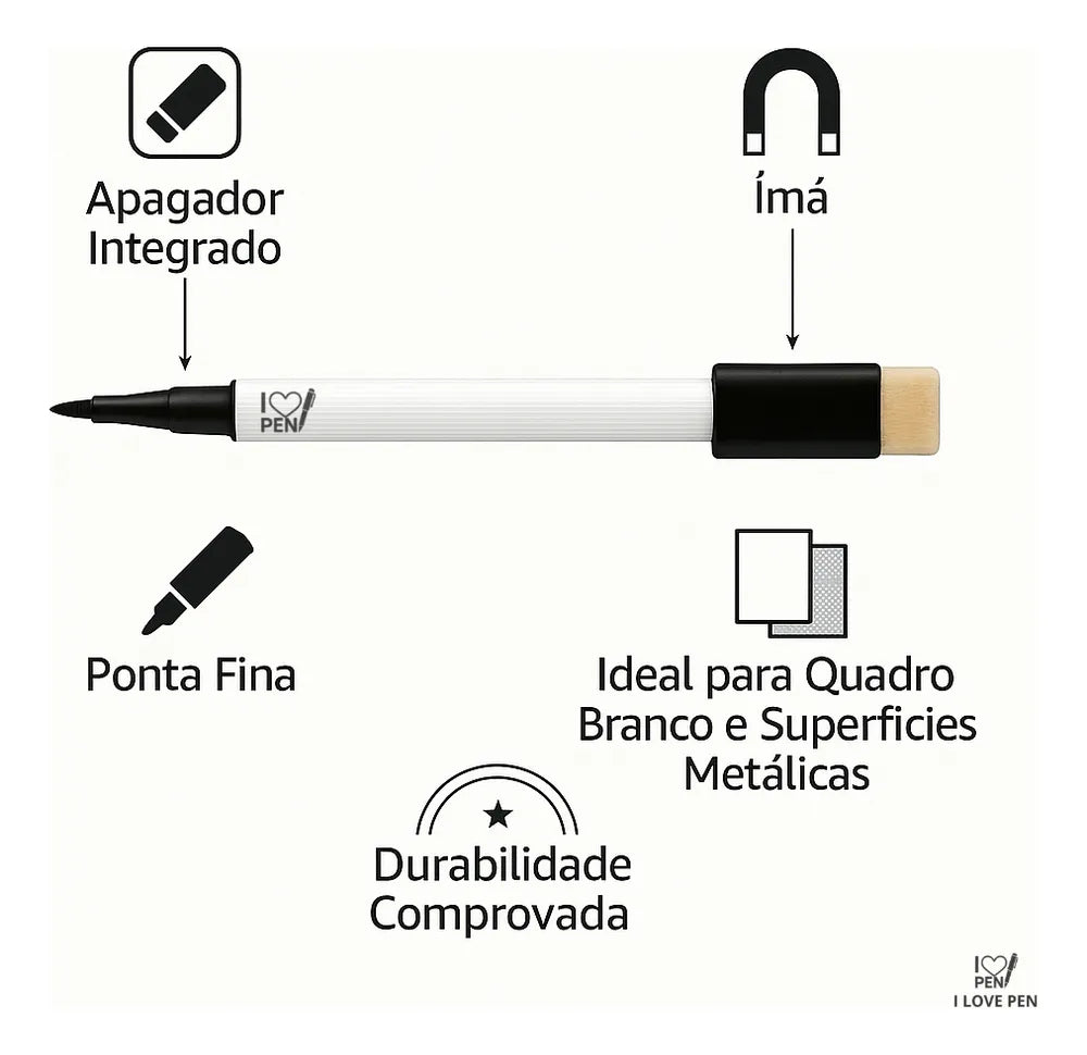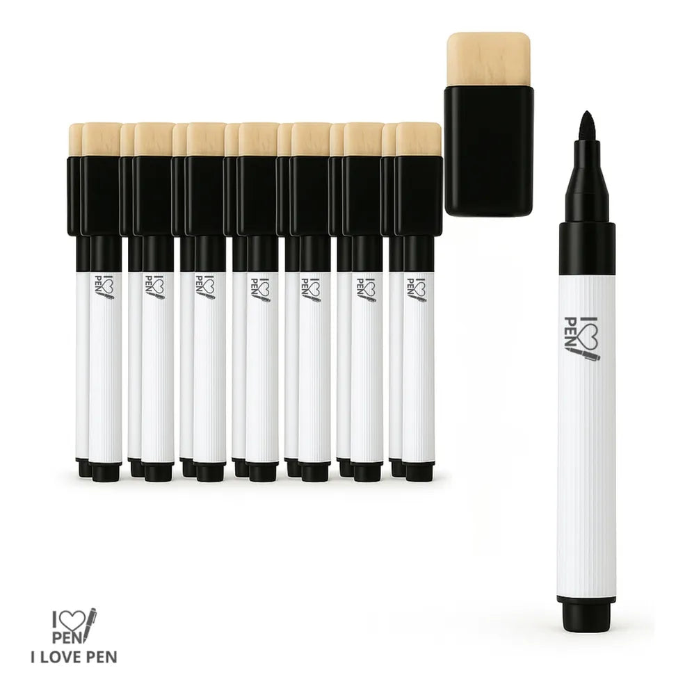 Este conjunto inclui 20 canetas pretas para quadro branco I Love Pen, cada uma equipada com um apagador e um ímã na tampa. Todas as canetas têm tinta preta e tampas de cores variadas. Por favor, note que a cor das tampas é variada e não pode ser escolhida.