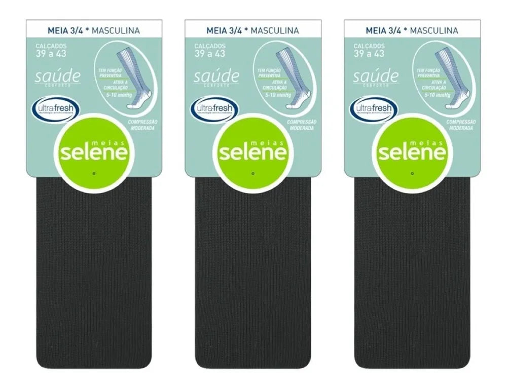 Preto 39-43 - 3 Meias 3/4 Masculina Compressão Moderada Selene 6096