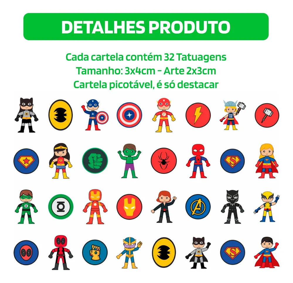 Contém 10 cartelas de 32 tatuagens infantis temporárias em cada pacote!