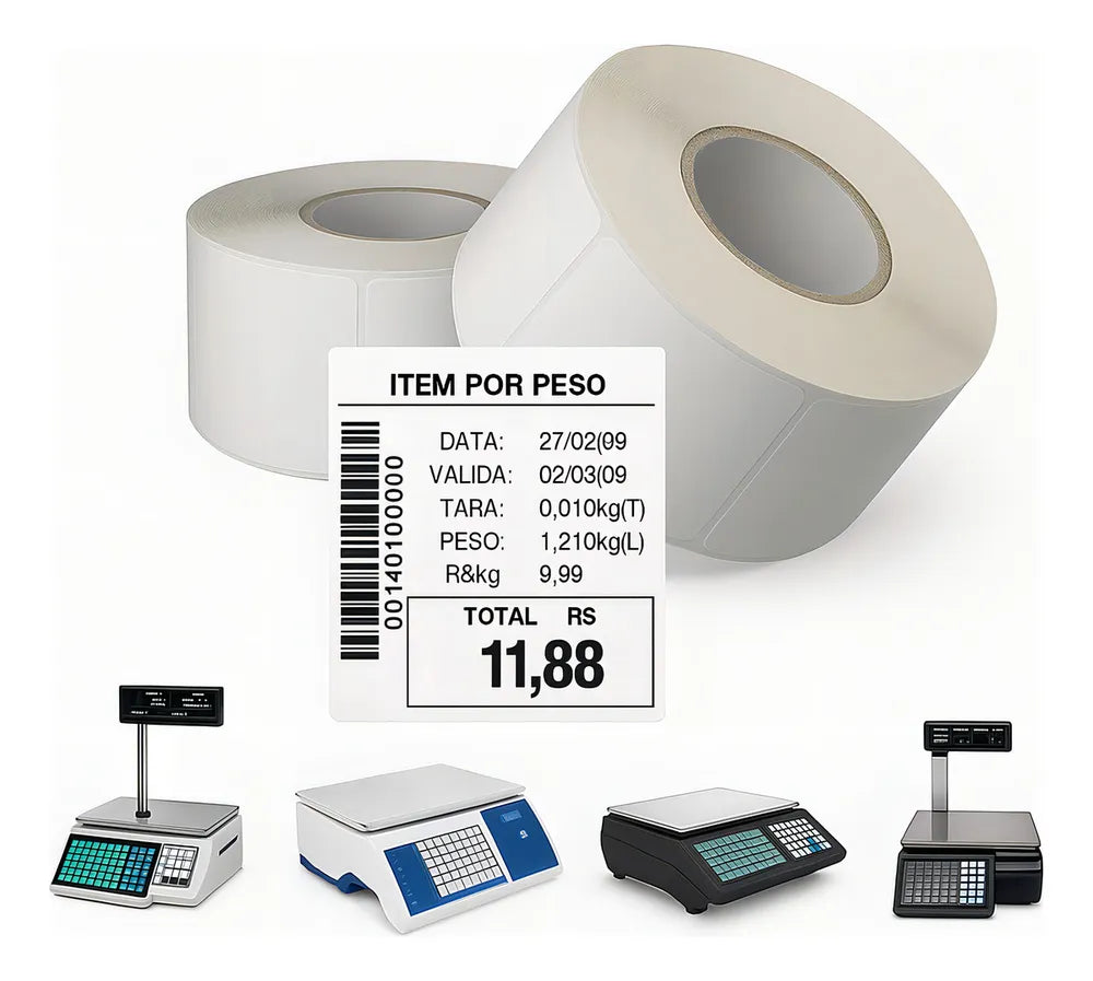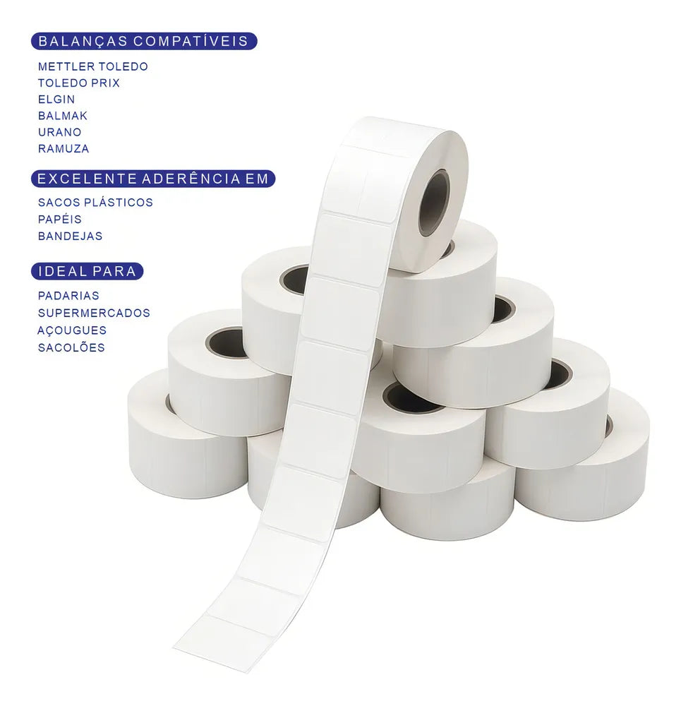 Cada rolo possui aproximadamente 500 etiquetas e 21 metros de comprimento, com diâmetro interno de 1,5 (38,1mm), padrão compatível com a maioria das impressoras integradas a balanças. A impressão térmica direta oferece ótima definição, legibilidade e durabilidade para etiquetas aplicadas em bandejas plásticas, sacos, PET, papel kraft e outros materiais usados na exposição de alimentos.