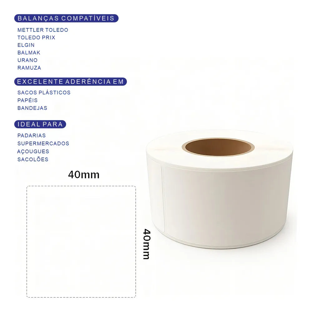 Produzida em papel térmico direto, essa etiqueta dispensa o uso de ribbons, proporcionando redução de custos operacionais e manutenção simples dos equipamentos. A dimensão de 40x40mm (4x4cm) é amplamente utilizada no varejo alimentar, sendo ideal para impressão de peso, preço, código de barras, validade e outras informações essenciais para o consumidor final.