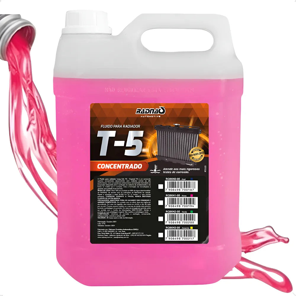 O Fluido para Radiador Long Life T-5 é um composto químico concentrado desenvolvido com matérias primas de alta performance. Com um poderoso anticorrosivo concentrado formulado na proporção adequada para a proteção do sistema de arrefecimento e de todos os metais que o compõe, inibe a formação de incrustações e garante uma perfeita troca térmica.