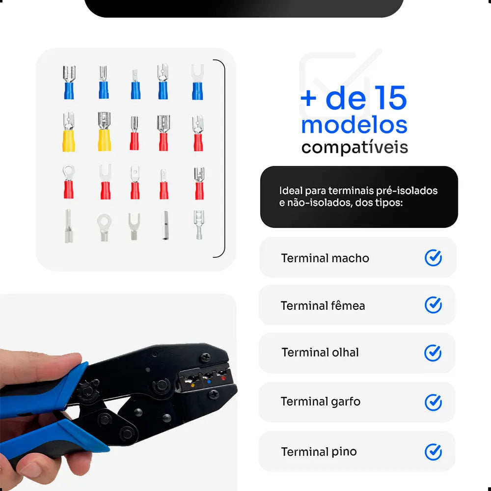 Compatível com diversos modelos de terminais, conectores e plugs, é a ferramenta ideal para quem precisa crimpar com agilidade e qualidade.