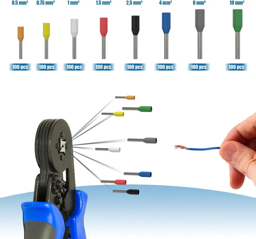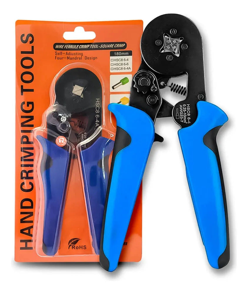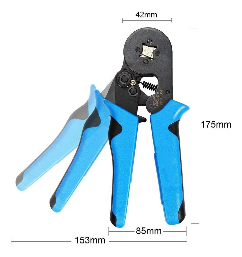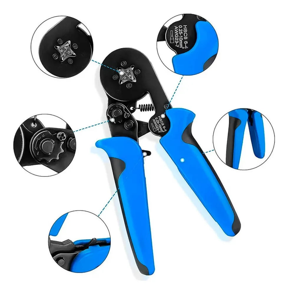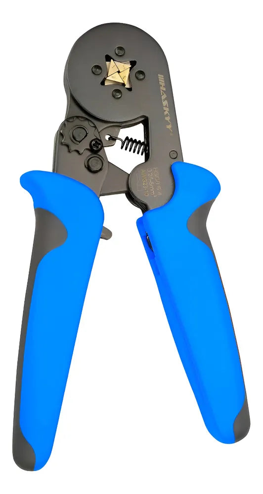 Alicate Prensa Terminais com ajuste de pinos tubulares, ideal para crimpagem de terminais do tipo pino tubular em fios e cabos com bitolas variando de 0,25 mm² a 10 mm². Seu acabamento pintado oferece uma camada de proteção contra corrosão e oxidação. Fabricado com materiais de alta durabilidade e qualidade, este alicate é perfeito para realizar crimpagem em terminais tubulares e ilhós.