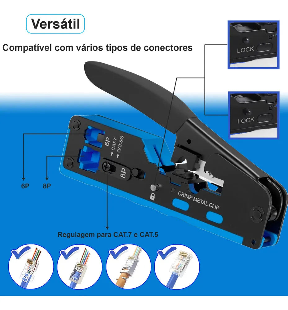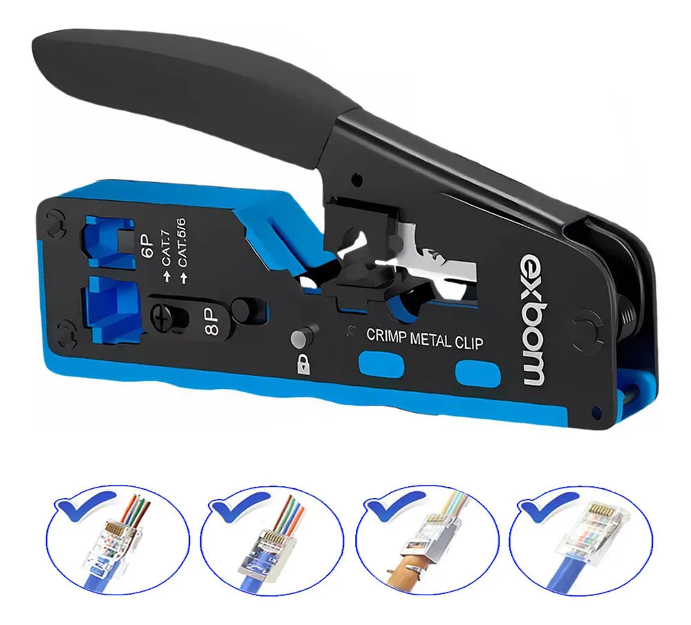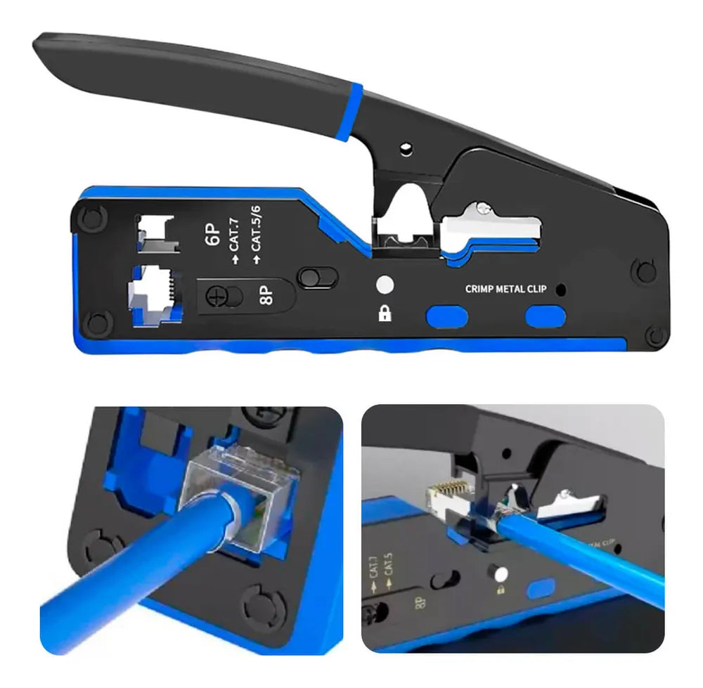 Compatibilidade com Vários Tipos de Cabos e Conectores: Projetado para trabalhar com diferentes categorias de cabos, como Cat7, Cat6e e Cat5e, e conectores RJ45, RJ12 e RJ11 - vazados ou não, o alicate pode ser utilizado em diversas aplicações de rede.