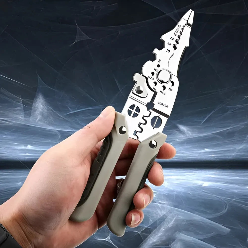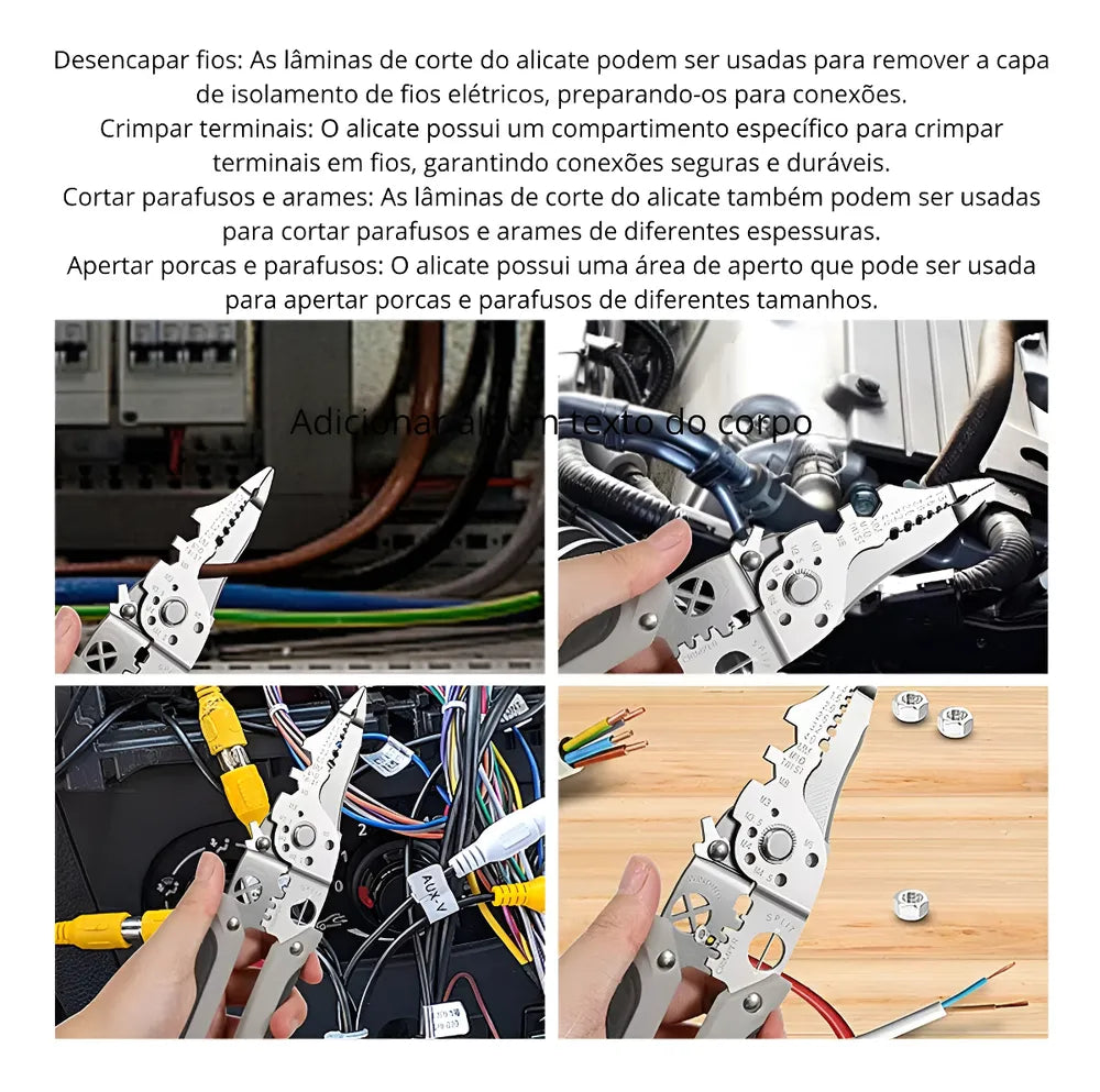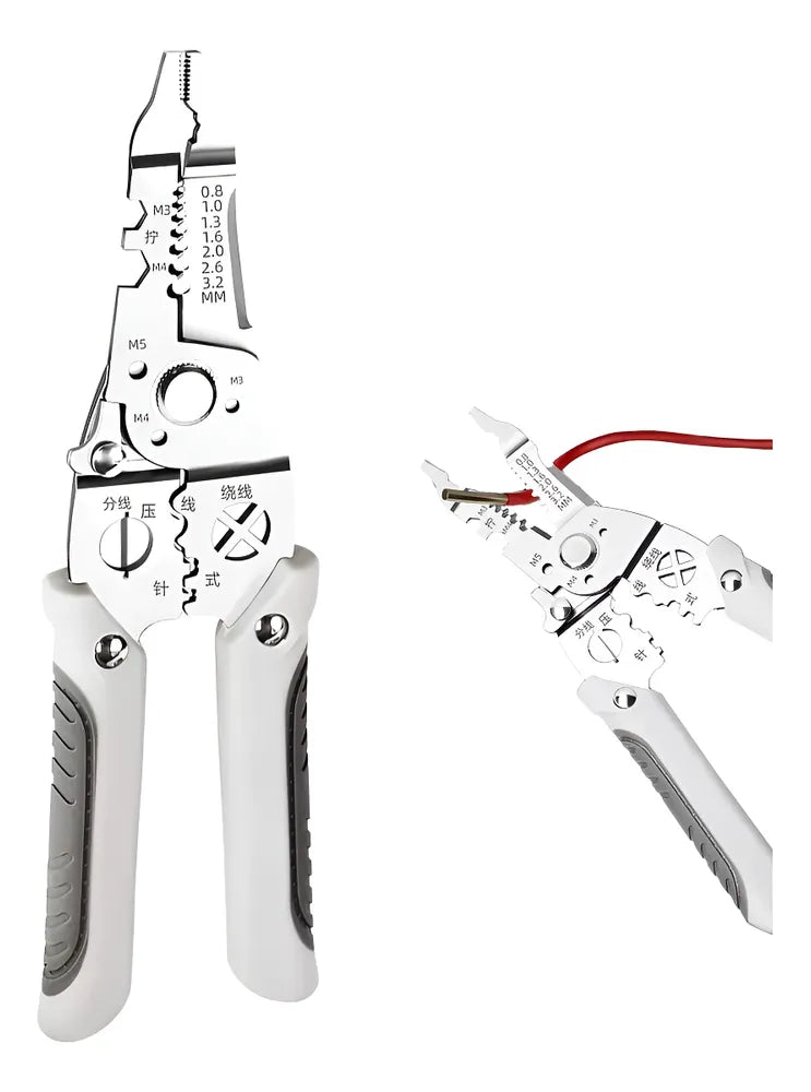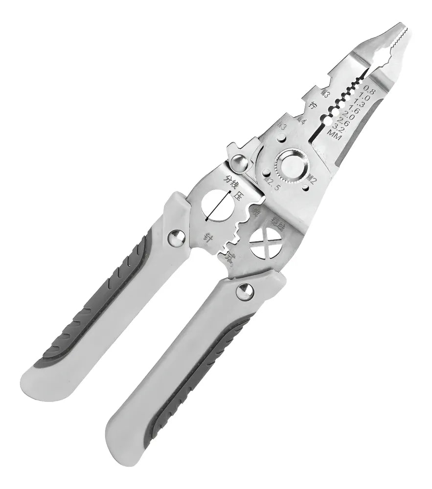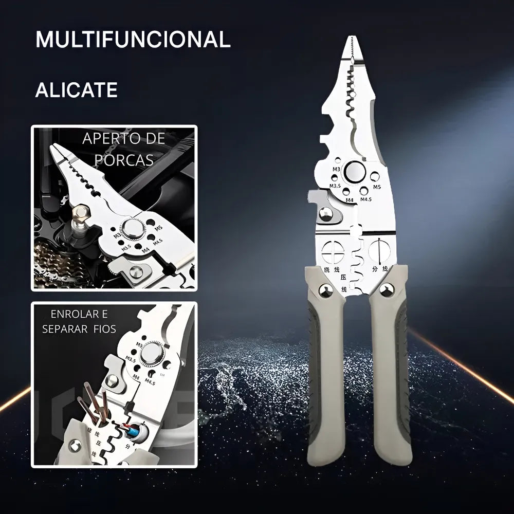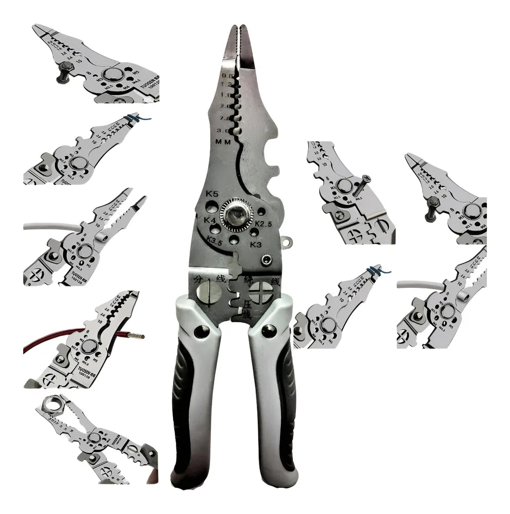 Alicate multifuncional com 22 funções. Projetado com vários orifícios de decapagem para descascar fios rapidamente.