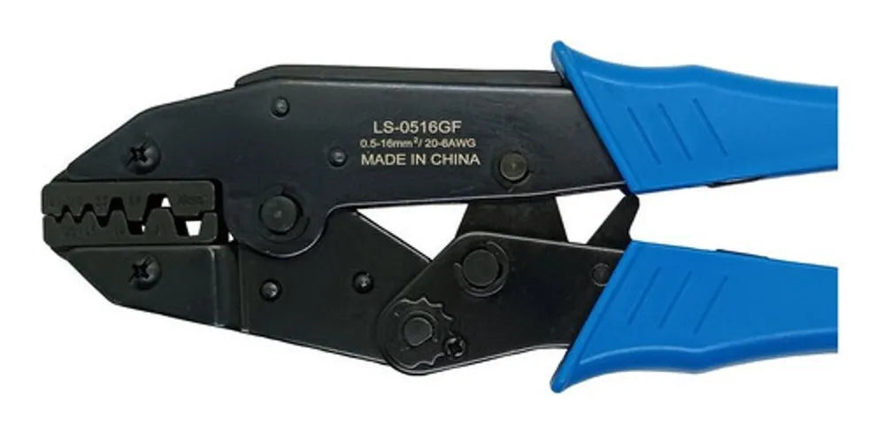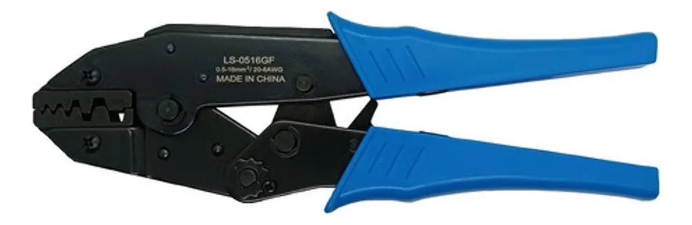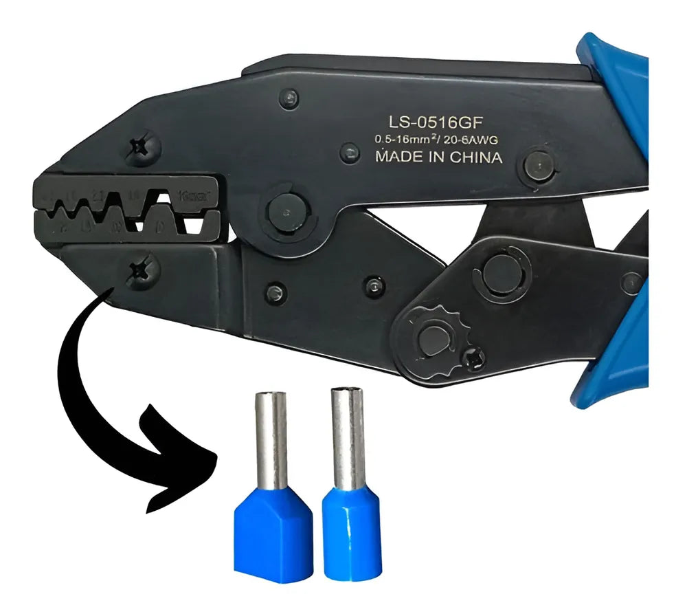 Alicate crimpador para terminal tubular ilhós, com catraca, proporcionando segurança para crimpar o terminal até o fim. Fabricado em aço carbono e cabo em PP.