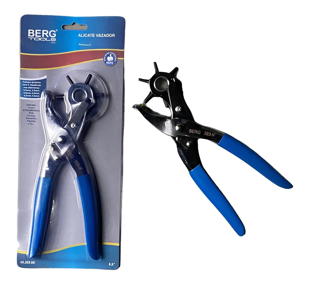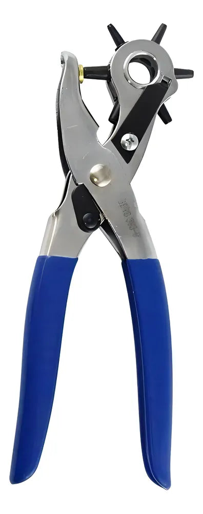 Alicate vazador 8,5 fabricado em metal de alta resistência, possui roda giratória de 6 bicos com tamanhos diferentes de furo e cabo de borracha aderente com formato anatômico. Indicada para furar couro, eva, cintos, tapetes e outros materiais.