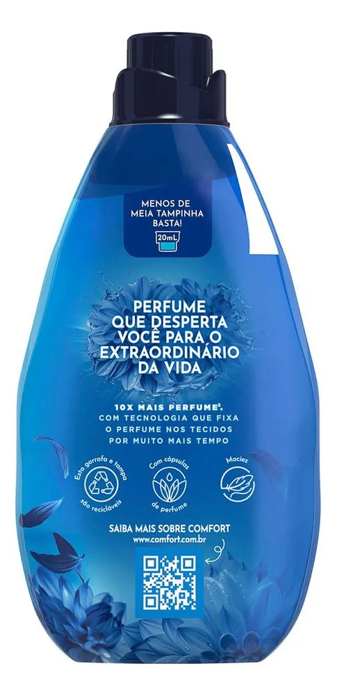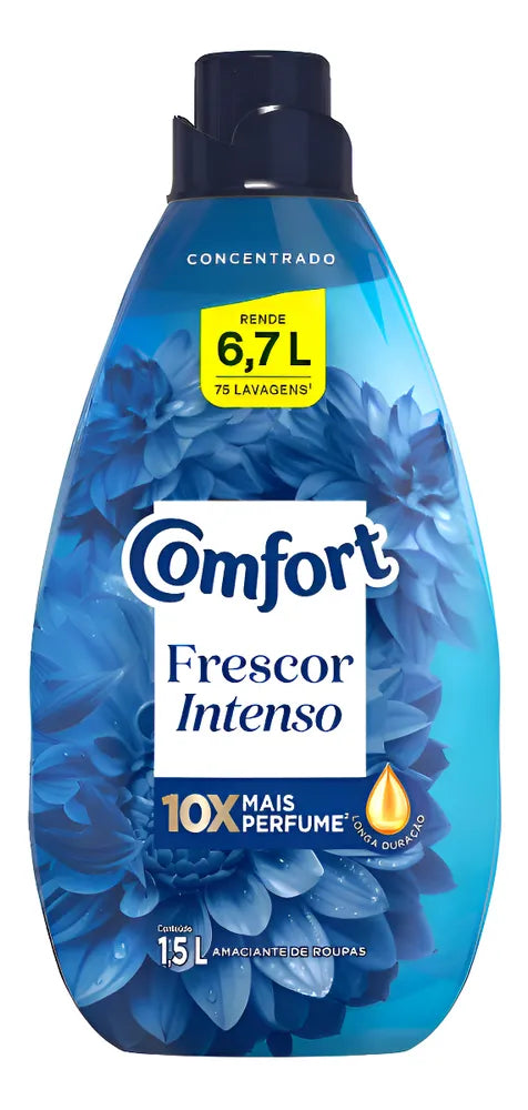 O Amaciante Concentrado Comfort Frescor Intenso tem 10x mais perfume** de longa duração, por isso deixa suas roupas perfumadas por muito mais tempo. Sua formulação incrível possui cápsulas de perfume que são liberadas durante a lavagem para deixar uma fragrância duradoura nas suas roupas e blindar o tecido contra o mau odor****. Comfort concentrado possui perfume encapsulado que penetra no tecido durante o processo de lavagem, deixando sua roupa muito mais cheirosa até mesmo depois de seca! O motivo? Quando você se movimenta, essas cápsulas de perfume para roupas se rompem e liberam essa fragrância incrível, fazendo com que aquele cheirinho de roupa lavada dure muito mais! Além disso, sua fórmula contém óleo de argan*****, um óleo natural com alto potencial nutritivo, que perfuma e trata suas roupas, prevenindo os danos da lavagem, mantendo as cores*** do tecido vibrantes por mais tempo, evitando a formação de bolinhas*** e esgarçamento***. Comfort te oferece tudo isso com um ótimo rendimento, por ser concentrado, menos de meia tampinha basta* rende muito! Além de cuidar e perfumar suas roupas, o amaciante concentrado Comfort cuida do meio ambiente, sua garrafa e tampa são feitas com plástico 100% reciclado e reciclável. O Amaciante Concentrado Frescor Intenso cuida das suas roupas, pois possui ingredientes capazes de alinhar e proteger o tecido, reduzindo o atrito entre as fibras durante o processo de lavagem, evitando futuros danos nas peças. *Considerando recomendação de dosagem para máquinas até 8 kg (20 ml). **Teste analítico com 22,5 ml de produto comparado com marca diluída, sem perfume encapsulado do mesmo fabricante. ***Benefícios de tratamento do amaciante obtidos versus roupas lavadas sem amaciante. ****Baseado em testes realizados com odores representativos. *****Com óleo de argan na composição da fragrância.