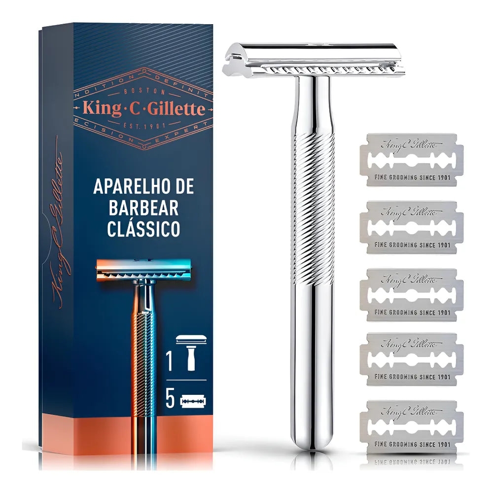 Experimente o conforto e a precisão do aparelho de barbear clássico King C. Gillette. Equipado com lâminas de barbear de duplo fio, oferece um barbear suave e preciso. Sua cabeça de segurança mantém as lâminas no lugar, garantindo tranquilidade durante o barbear.