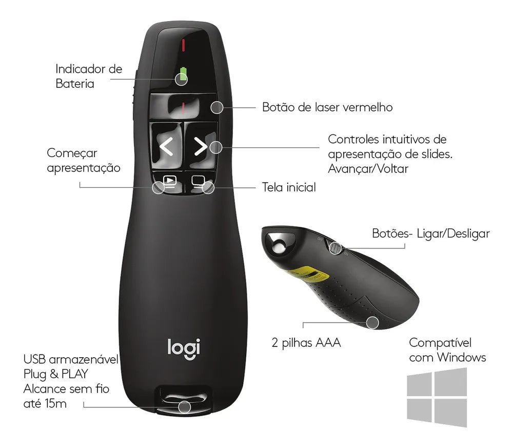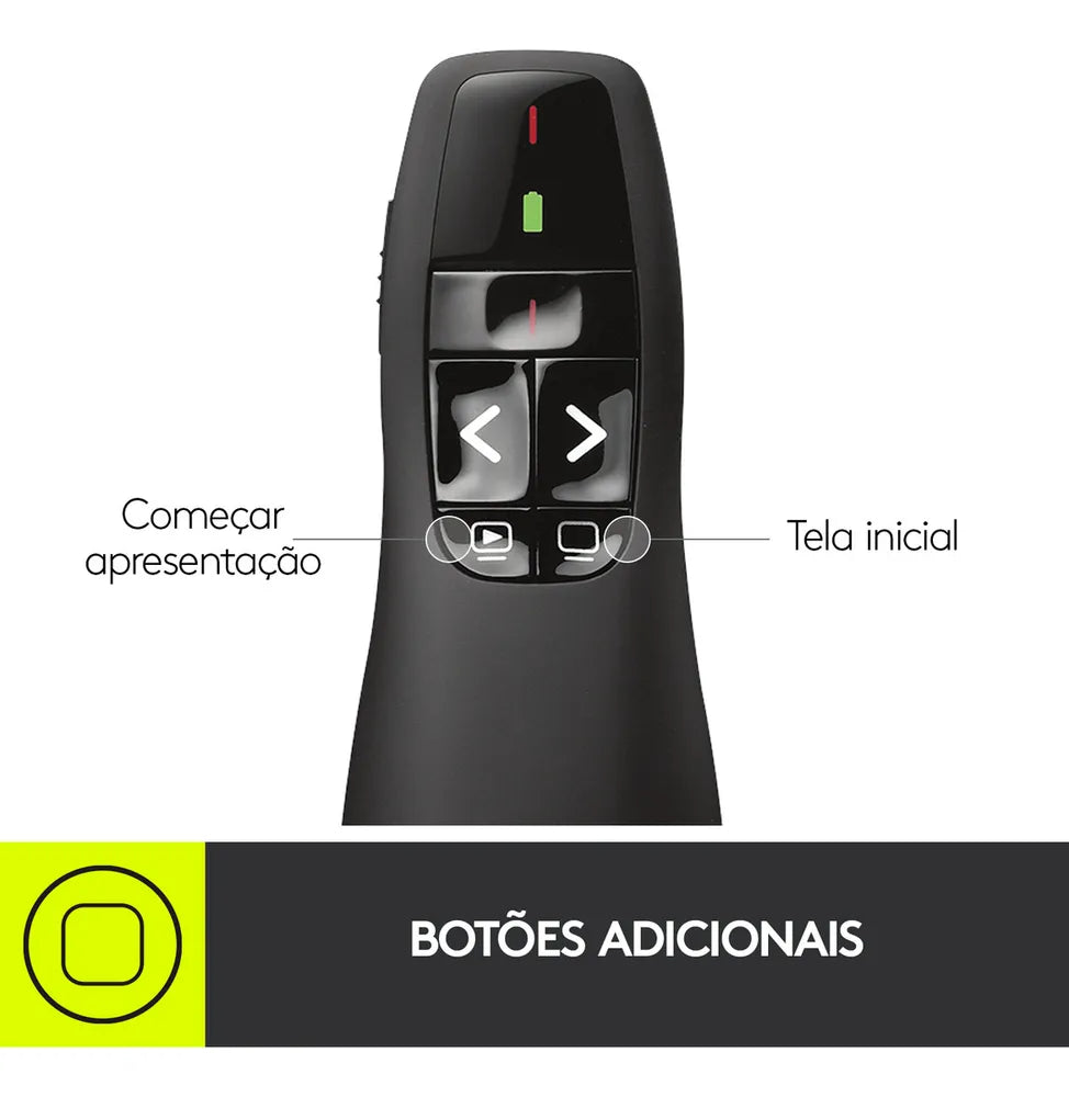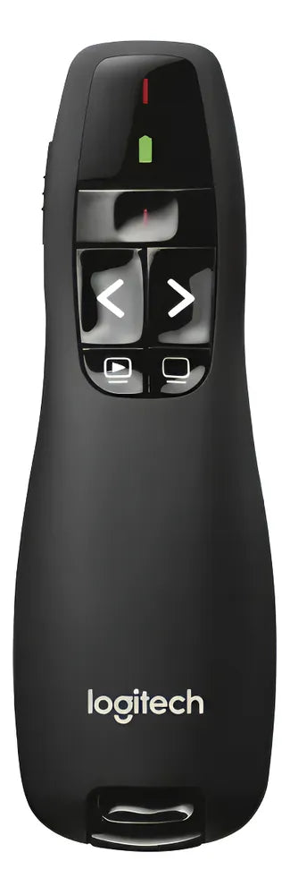 O apresentador sem fio Logitech R400 foi projeto para ajudá-lo a ser destaque em suas apresentações. Os botões intuitivos são simples e o ajudam a navegar na sua apresentação com confiança e são localizados facilmente por toque. O formato adapta-se perfeitamente à sua mão. Dispõe de um ponteiro laser vermelho, fácil de ver na maioria dos fundos, e tem um alcance sem fio de até 15 metros, que lhe oferece a liberdade de movimento na sala para estar entre o seu público. Com um receptor sem fios plug-and-play armazenável, é simples iniciar - não existe software para instalar. E quando acabar a apresentação, guarde o receptor no apresentador para facilitar o armazenamento.