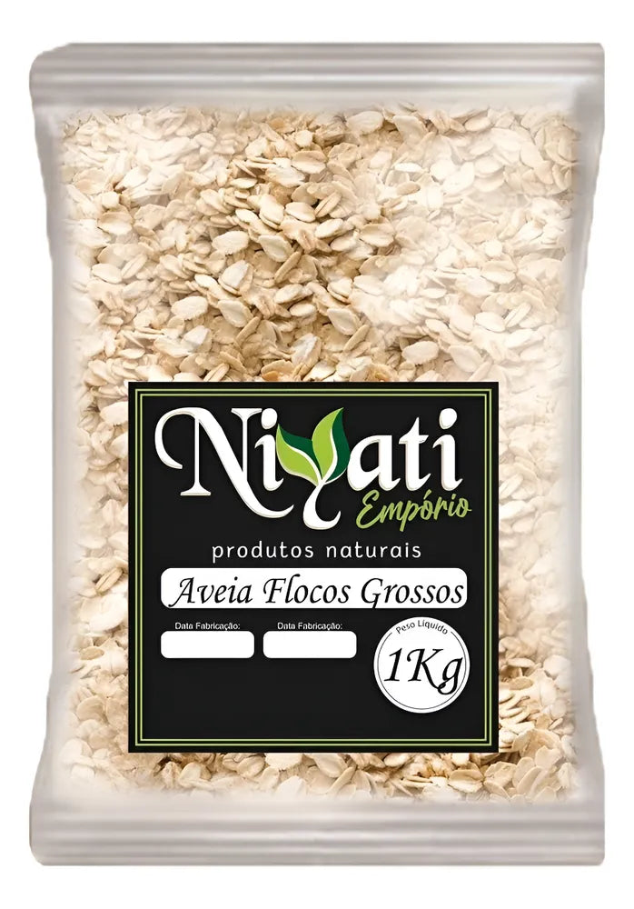 Pode ser consumida de acordo com a sua preferência ou adicionada aos sucos, frutas, shakes e vitaminas. A marca Niyati garante a qualidade e frescor da Aveia Flocos Grossos Safra Nova. Este produto é embalado em pacote de 1 kg, ideal para manter a validade e frescor. Apesar de não ser livre de glúten, orgânica ou vegana, é uma excelente opção para quem busca uma alimentação saudável e equilibrada. A aveia em flocos é perfeita para diversas receitas e pode ser incorporada facilmente na sua dieta diária.