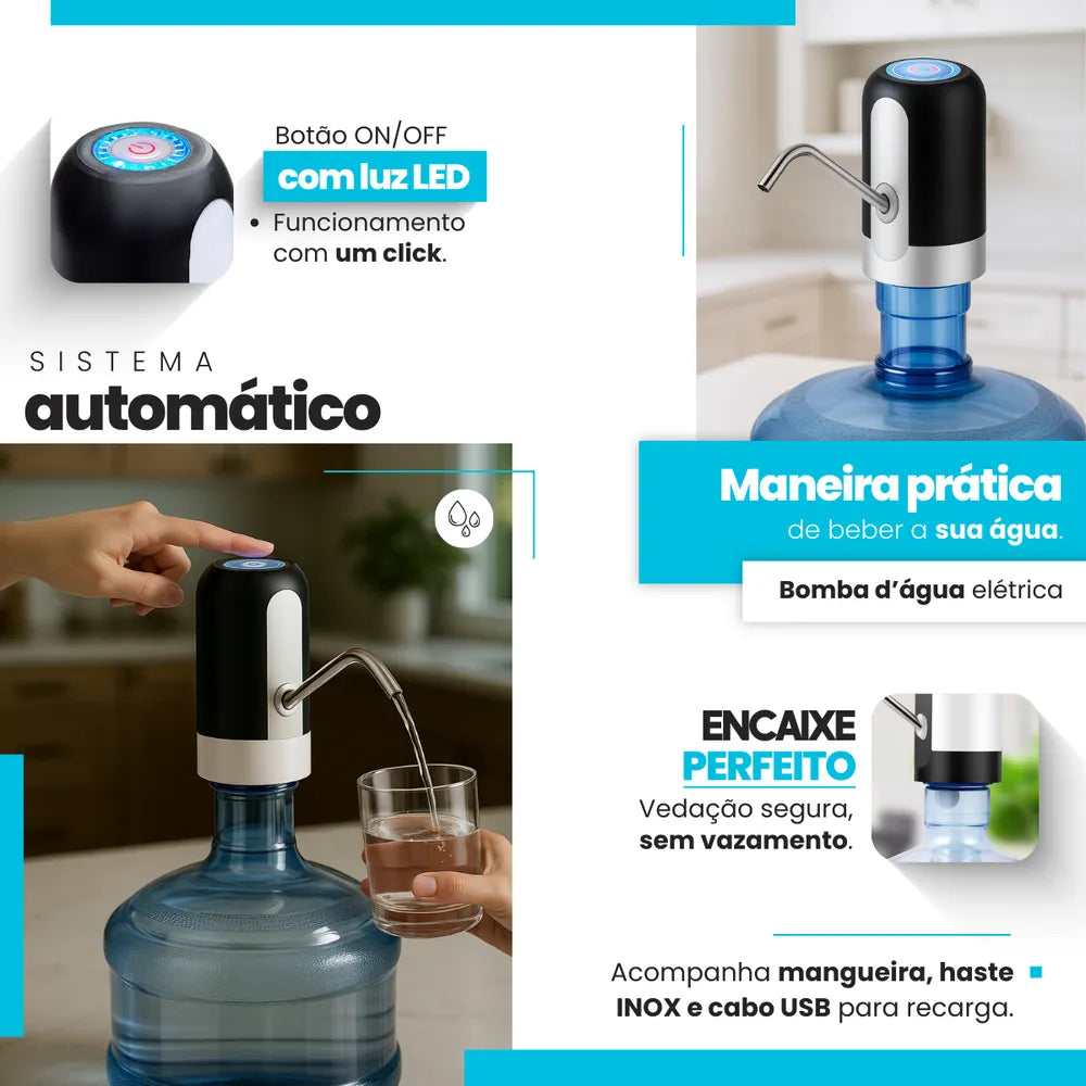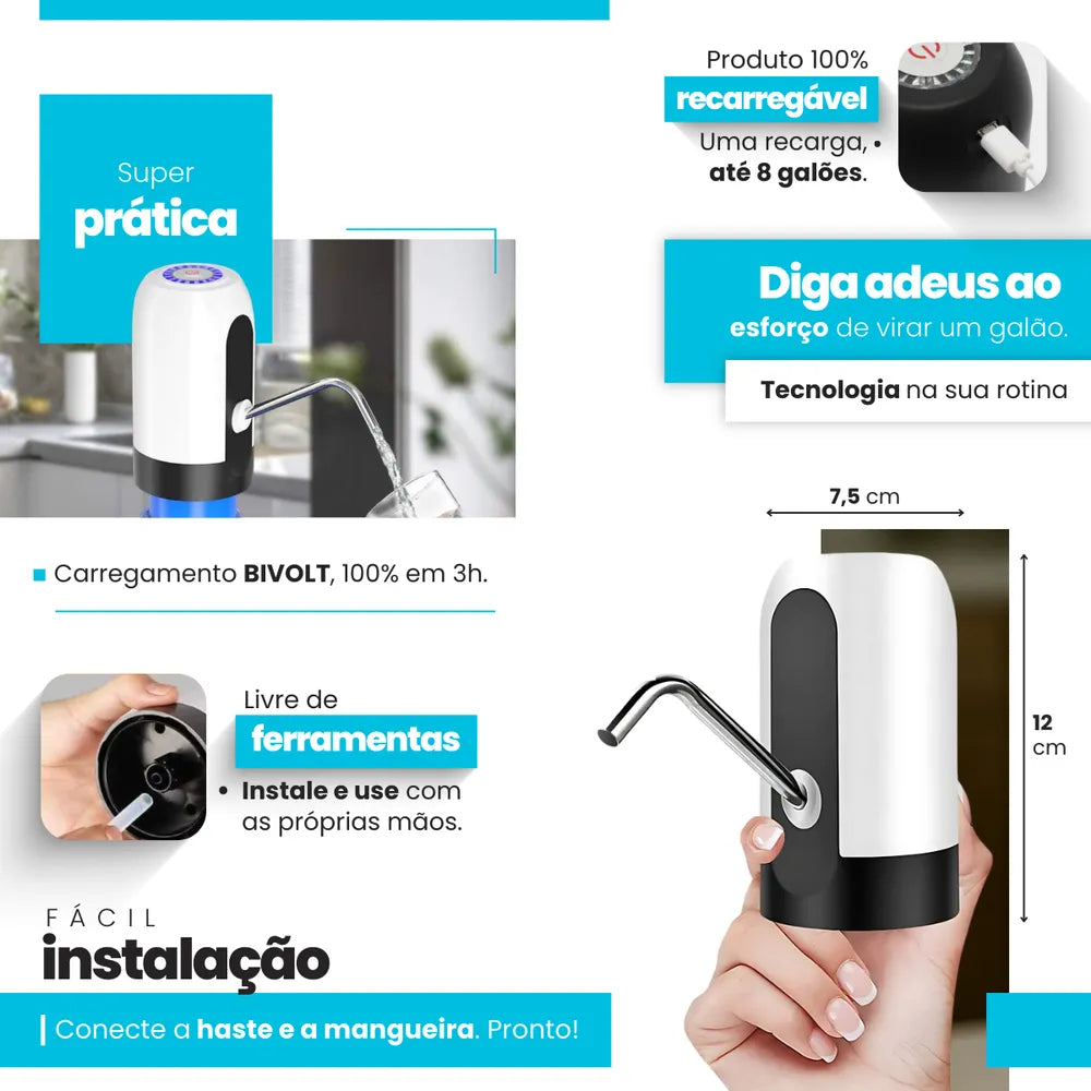 O Bebedouro Bomba Elétrica Portátil Davely é a solução prática e moderna para servir água com rapidez e higiene. Compatível com garrafões e galões padrão de 10L, 20L e 5 galões, é perfeito para uso residencial, comercial ou em viagens.