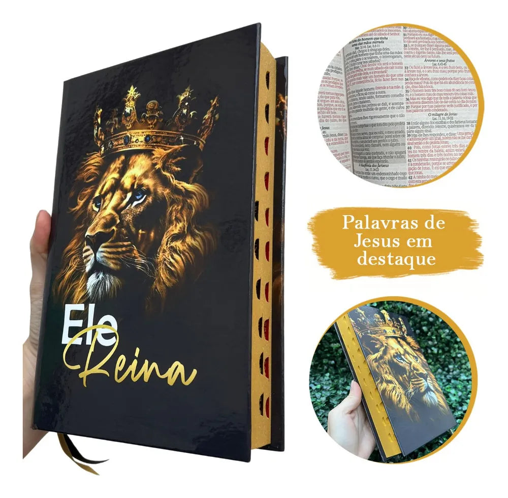 Bíblia Sagrada Evangélica Leão Capa Dura com Harpa, Índice, LETRA MÉDIA, FOLHA ECOLÓGICA (há foto REAL das letras no anúncio), palavras de Jesus destacadas e Lateral Rosa, um detalhe único que torna essa Bíblia perfeita para levar a igreja, cultos de jovens ou presentear.