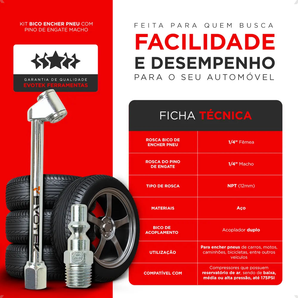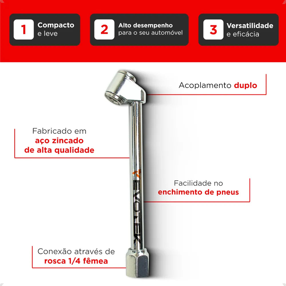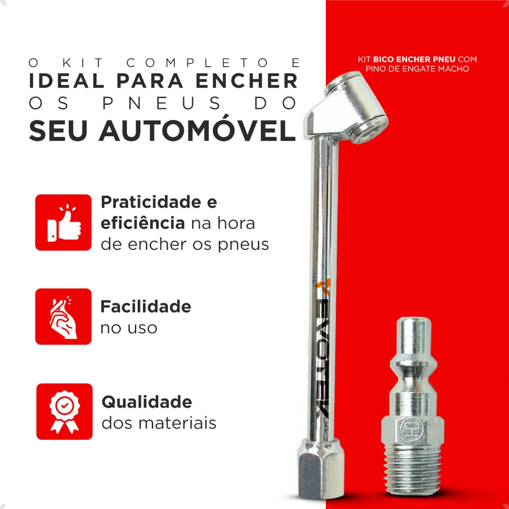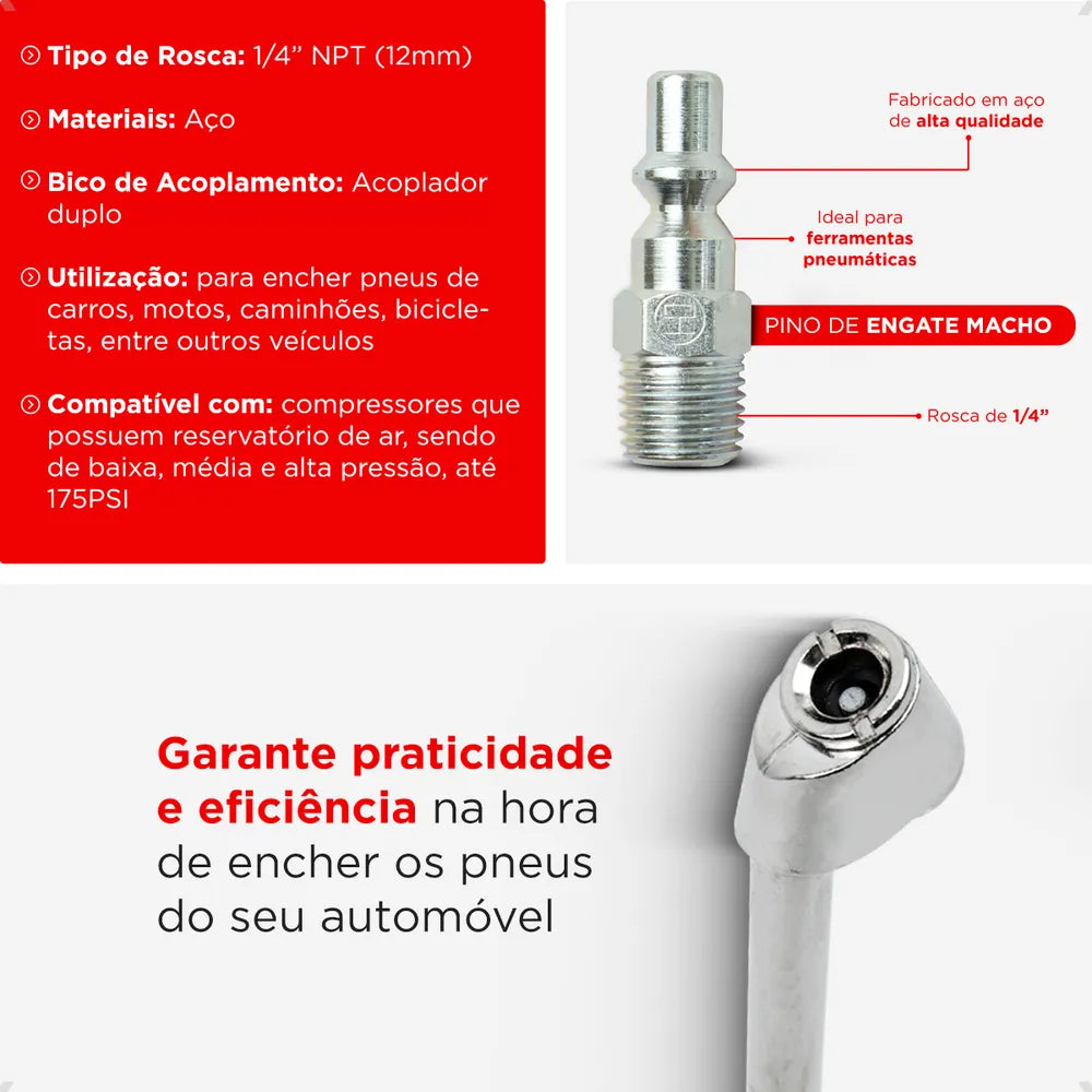 O Bico de Encher Pneu é a solução rápida para lidar com pneus vazios. Equipado com uma rosca fêmea de ¼ de polegada, sua versatilidade se destaca com acoplador duplo, garantindo uma conexão firme e rápida.