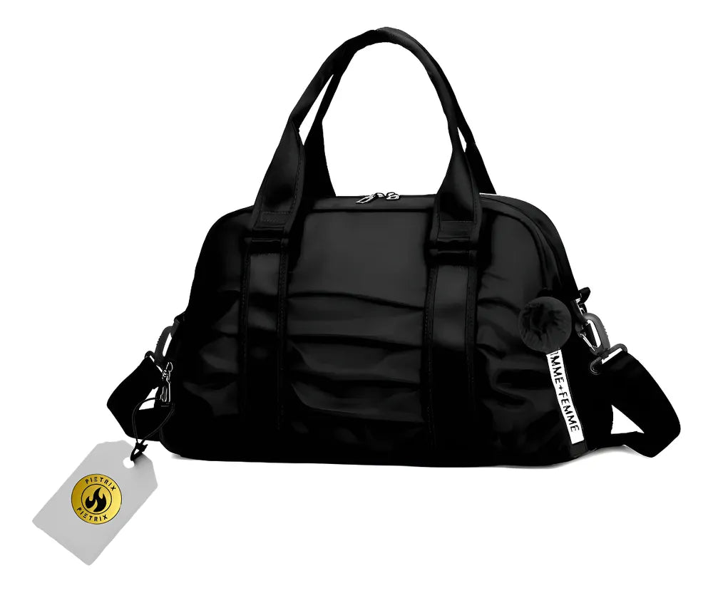 Possui alça de mão dupla e alça lateral. Vem com um saco extra de TNT para colocar sapatos