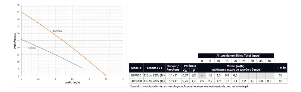 - Sucção (Entrada) / Recalque (Saída): 1 pol. (BSP);