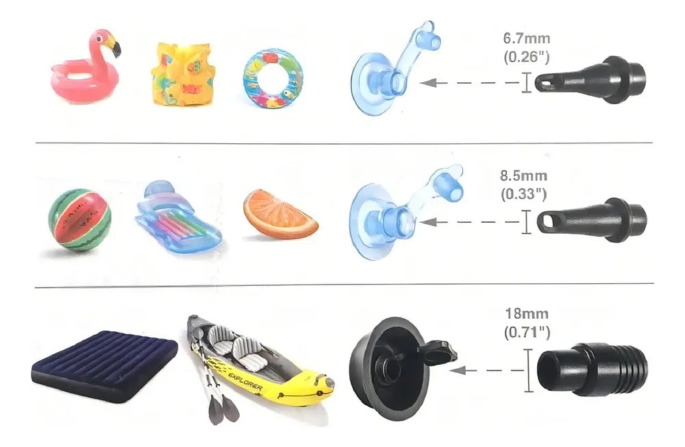 Produto igual ao anunciado. Tem 3 bocais de tamanhos diferentes, então serve para encher uma variedade de objetos. No meu caso, funcionou perfeitamente pra minha piscina.