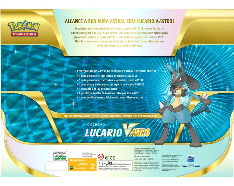 Esta caixa especial traz cartas promocionais holográficas jogáveis de Lucario V e Lucario V-ASTRO, perfeitas para fortalecer seu deck, além de uma versão extragrande de Lucario V-ASTRO, perfeita para exibir em sua coleção.