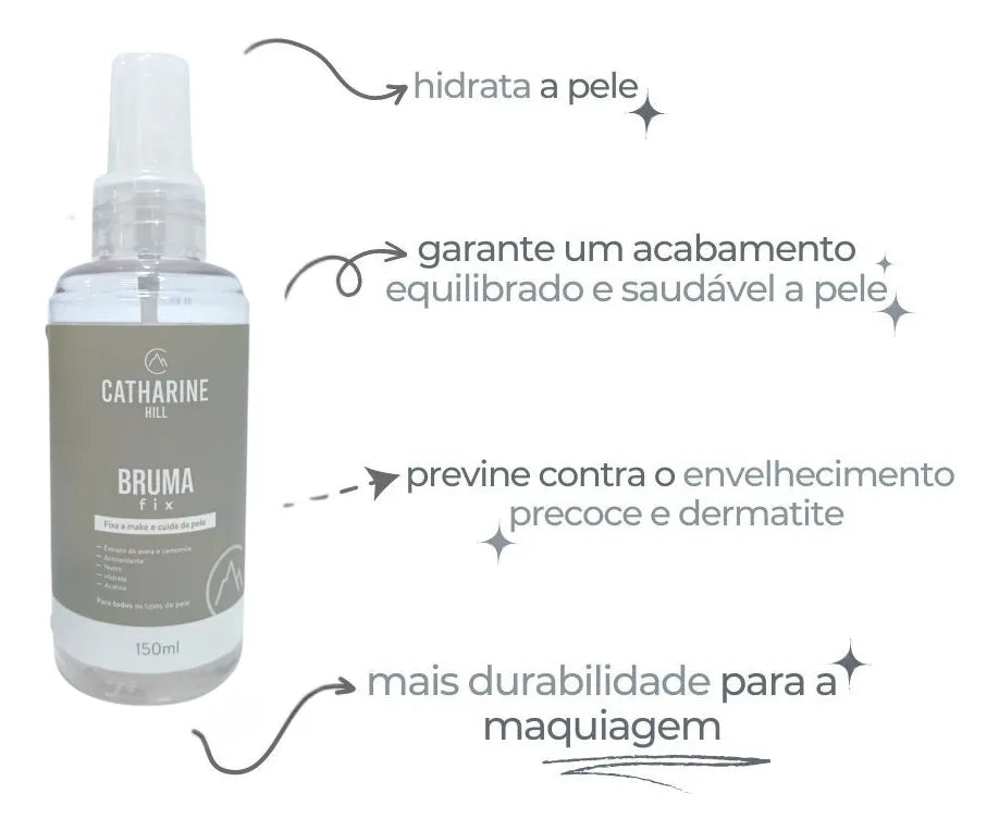 A Brumafix veio para potencializar a durabilidade da make, fixando a maquiagem, hidratando a pele e ainda garantindo um acabamento viçoso. Livre de parabenos, vegana, com extrato de aveia e extrato de camomila, a Brumafix, ajuda também na restauração dos tecidos da pele, com ação suavizante e amaciante, acalmando e prevenindo contra o envelhecimento precoce e dermatite.
