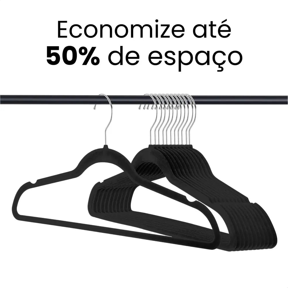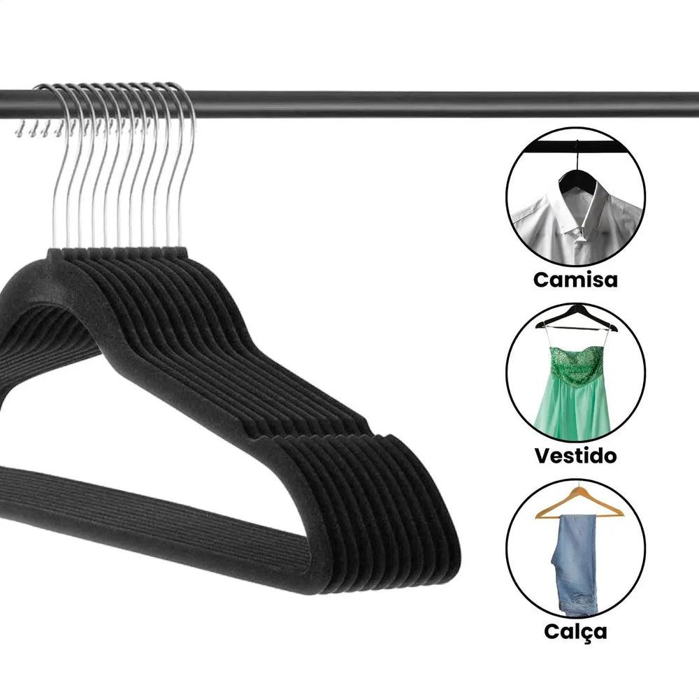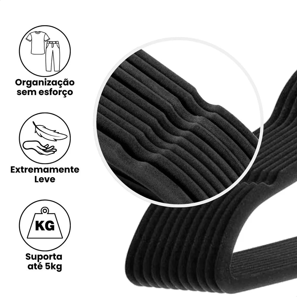 Kit Cabides Adulto Aveludado com tecnologia anti deslizante, para manter as roupas no local sem bagunça. Os cabides têm o gancho em aço com giro de 360° e corpo flexível com tecido de veludo que não marcam as roupas, e suportam até 4Kg por cabide.
