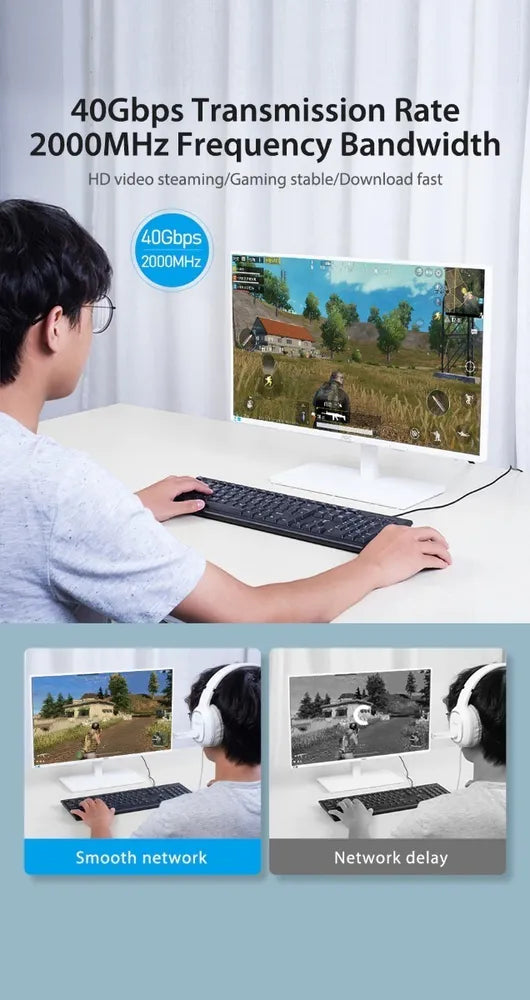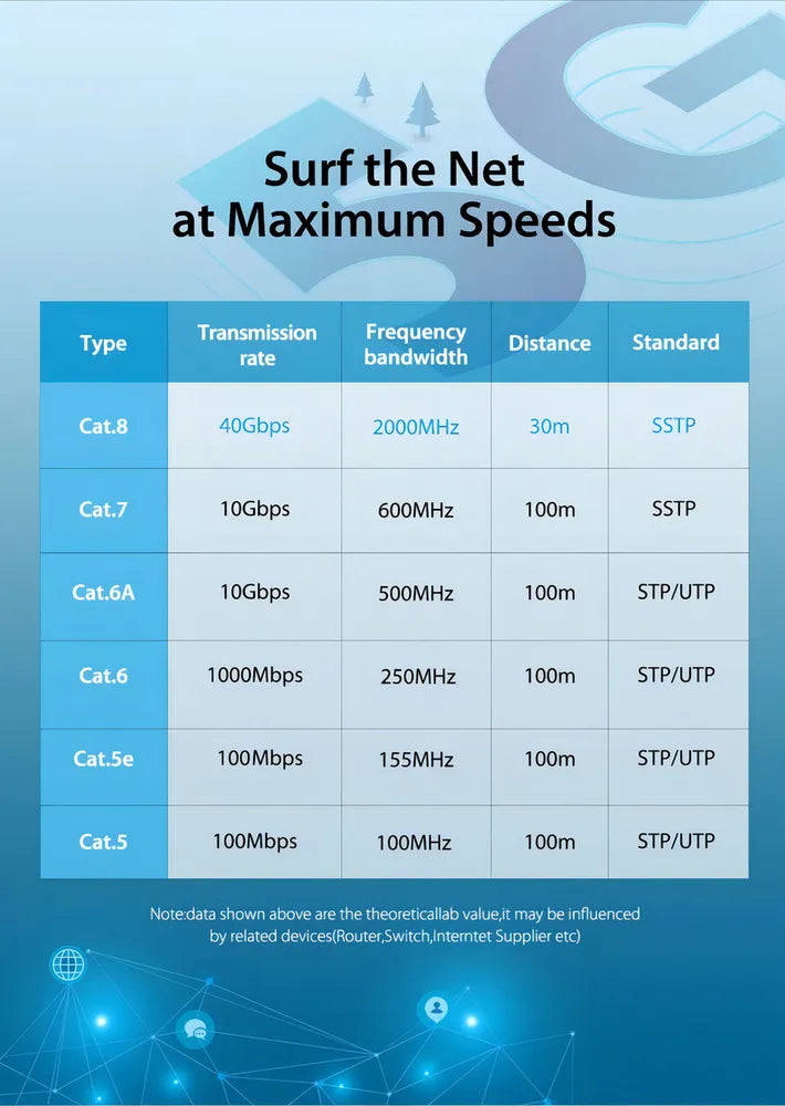 O cabo Ethernet Cat8 suporta o padrão BASE-T de 40 Gbps e é 4x mais rápido em velocidade de rede do que os cabos Cat7 padrão que suportam 10 Gbps.