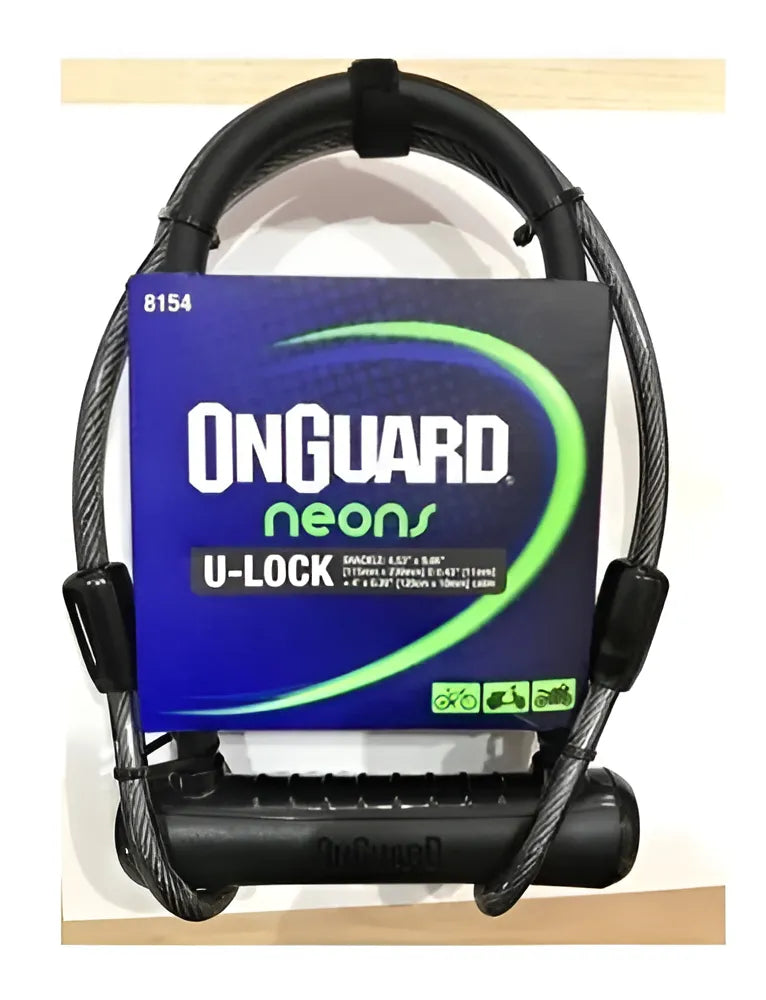 Cadeado trava U-Lock Onguard Neons modelo 8154 fabricado em aço maciço e revestido para não danificar a pintura da bicicleta, acompanha um cabo de aço reforçado de 120cm x 10mm ideal para travar as rodas ou algum acessório junto à bicicleta. Mais resistente que os modelos de cabo de aço, esta linha U-Lock tem sido apreciada pelos ciclistas que precisam deixar a bicicleta presa em locais abertos. O bloqueio do parafuso é duplo, travando os dois lados da trava, o que proporciona maior resistência e alta resistência de tração, bloqueando firmemente em dois lados da barra. O cilindro da chave da Onguard é fácil de manusear, com sistema de trava e liberação, oferecendo resistência contra ataques físicos.