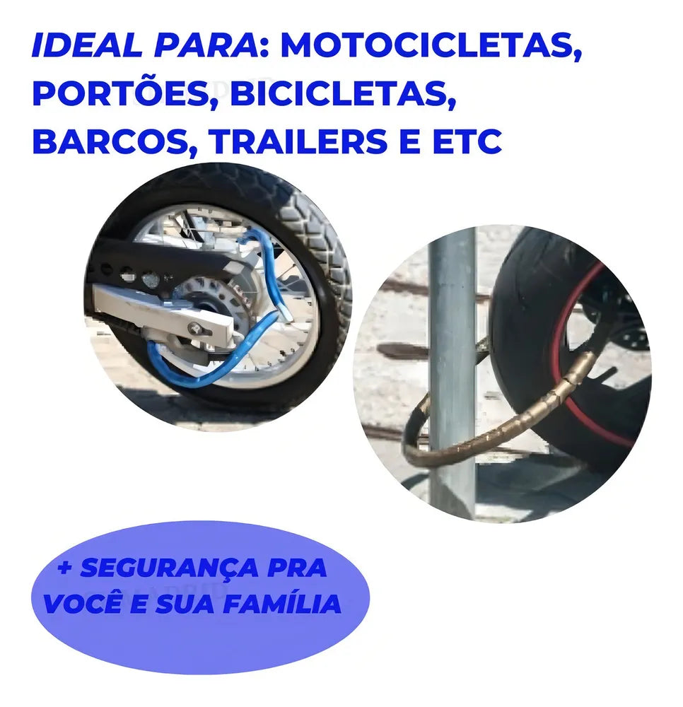 - Cadeado para motocicletas e Bicicletas com 100 cm de perímetro, corpo flexível composto de anéis de aço articulados com espessura 22mm.