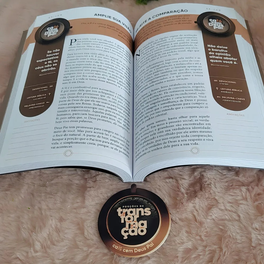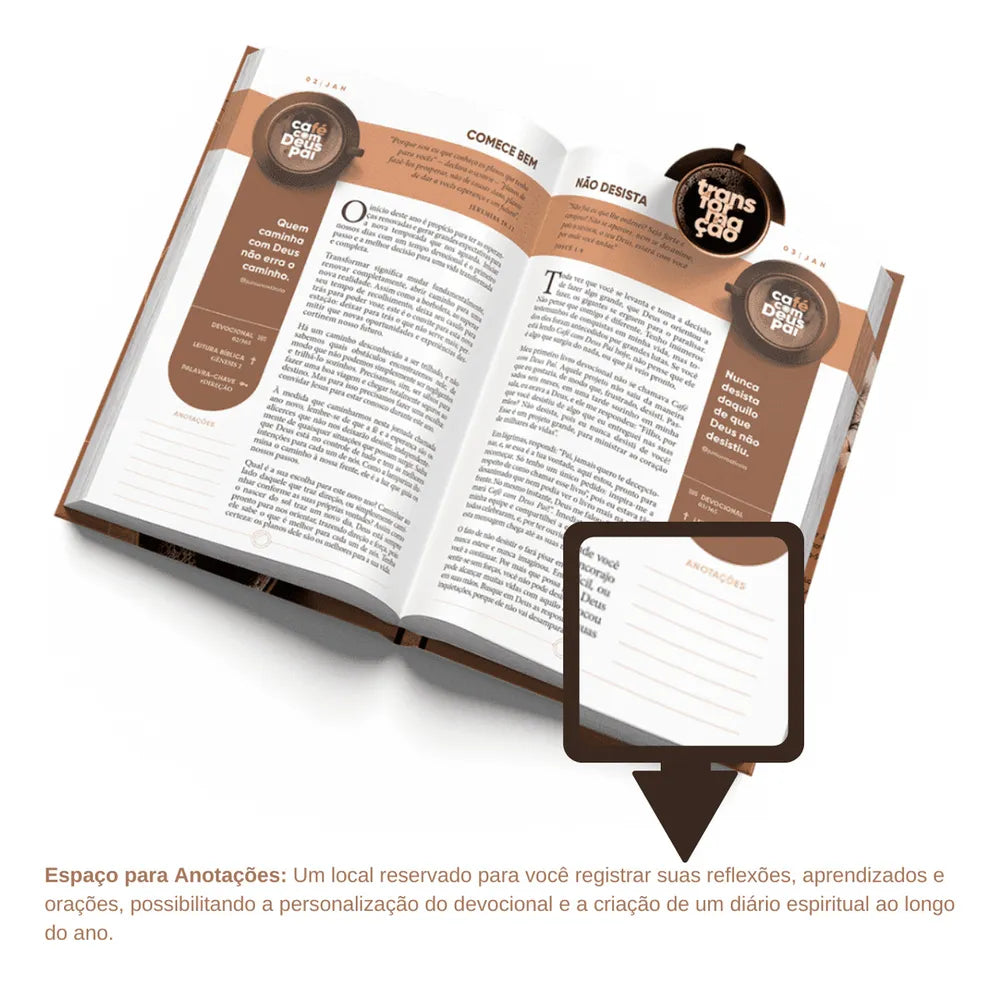 Imagine parar por alguns instantes e desfrutar de um momento diário com alguém que te ama e tem a resposta para Que tal desfrutar de um momento íntimo com alguém que te ama e tem as respostas para todas as suas aflições? Essa é a experiência que você encontra em cada página de Café com Deus Pai. São 366 mensagens que te levarão a uma jornada com devocionais diários ao longo do ano, onde você é convidado a ter um encontro com Deus Pai. As páginas interativas irão envolvê-lo ainda mais nessa jornada, permitindo que você reflita, anote suas inspirações e compartilhe suas experiências. A cada dia, você encontrará uma mensagem única e significativa, especialmente selecionada para nutrir sua alma e fortalecer sua fé. Para tornar o seu dia ainda mais especial, frases inspiradoras são destacadas ao longo do livro, proporcionando motivação e encorajamento sempre que precisar. E para aqueles que desejam se aprofundar ainda mais na Palavra de Deus, também é incluso um plano de leitura bíblica, que o guiará por uma jornada de conhecimento e descoberta. Além de proporcionar um novo modo de apreciar uma xícara de café, este livro mostrará como a vida pode ser saboreada. Sim, Deus Pai deseja tomar café com você.