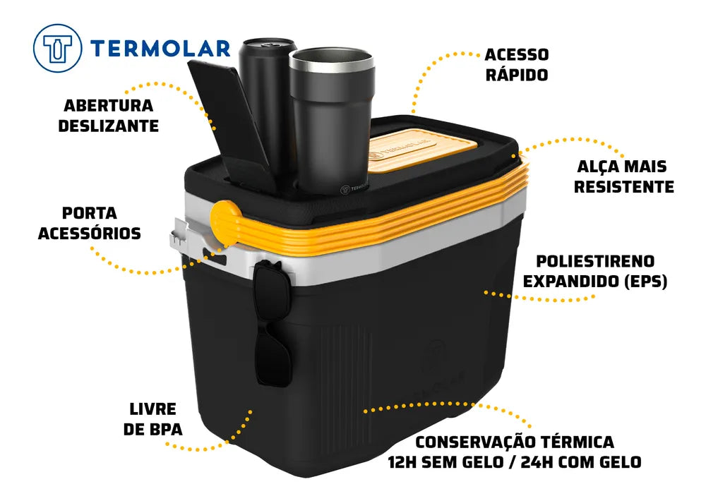 Outro diferencial está nas pequenas alças laterais, que possibilitam prender sacolas ou cordas elásticas. Um produto com a qualidade e garantia Termolar.