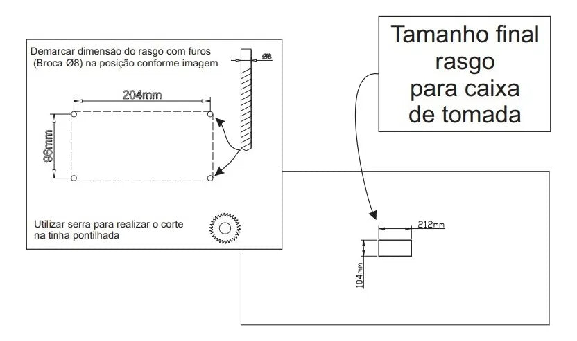 b) Corte para instalação (marcenaria): 21,5 x 10,5 cm