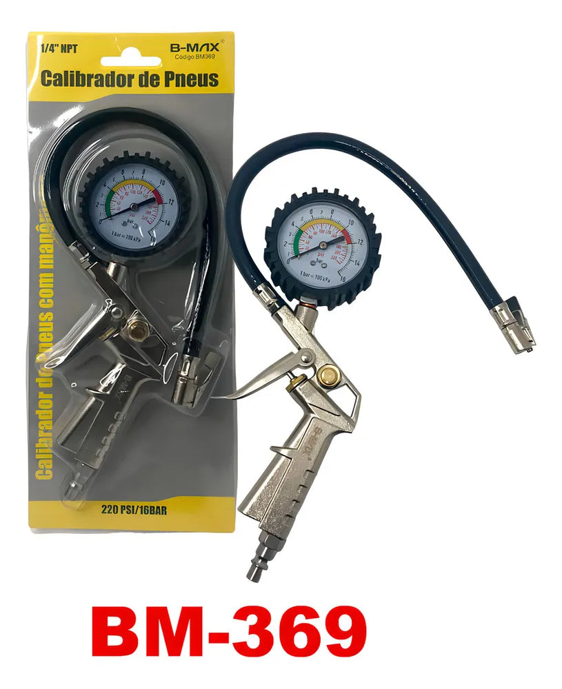 Calibrador Manual é indicado para inflar, esvaziar e medir a pressão dos pneus. Adequado para uso em automóveis leves, motos, bicicletas e pneus menores como carrinho de mão com câmara de ar. Conta com manômetro e encaixe de rosca de 1 / 4 NPT. Sua estrutura em alumínio proporciona maior resistência à oxidação e corrosão. O bico flexível oferece praticidade na aplicação.