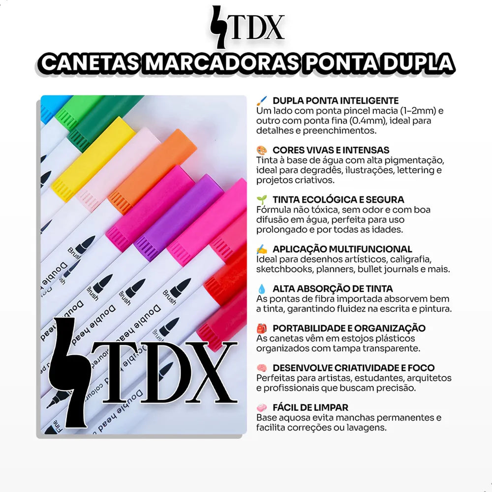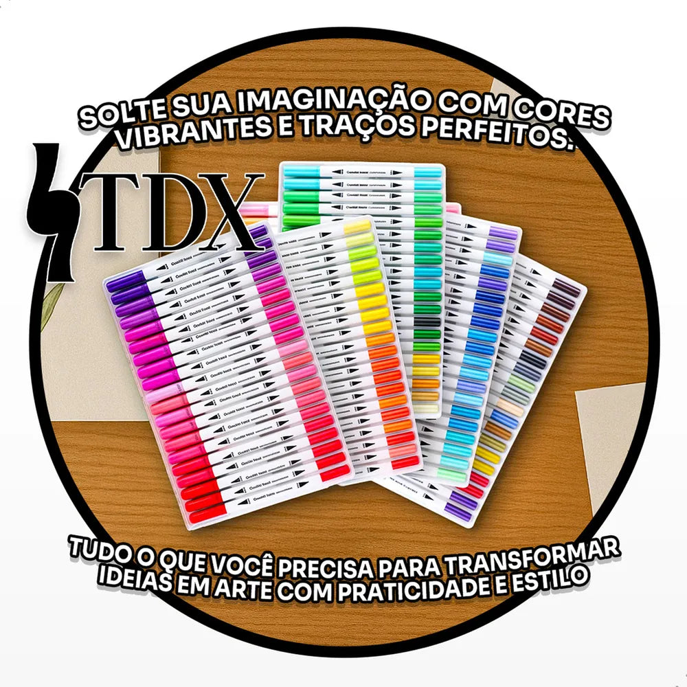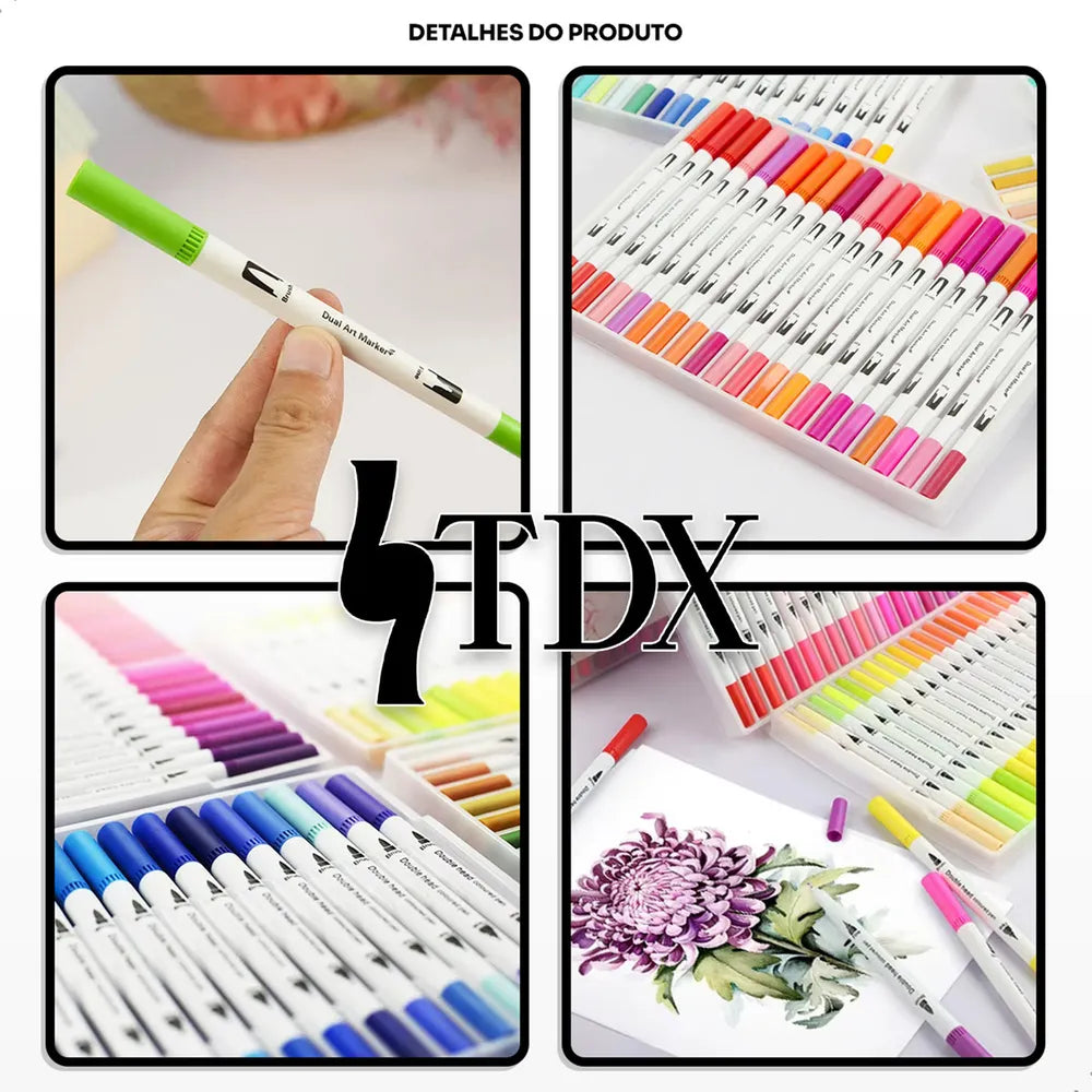 Perfeita para artistas, ilustradores, amadores e profissionais, a Caneta Brush Pen Kit com 12 Cores oferece versatilidade e qualidade superior em cada traço. Com pontas duplas (fina e pincel), você cria desde detalhes precisos até efeitos de pincelagem, tudo em um único produto!