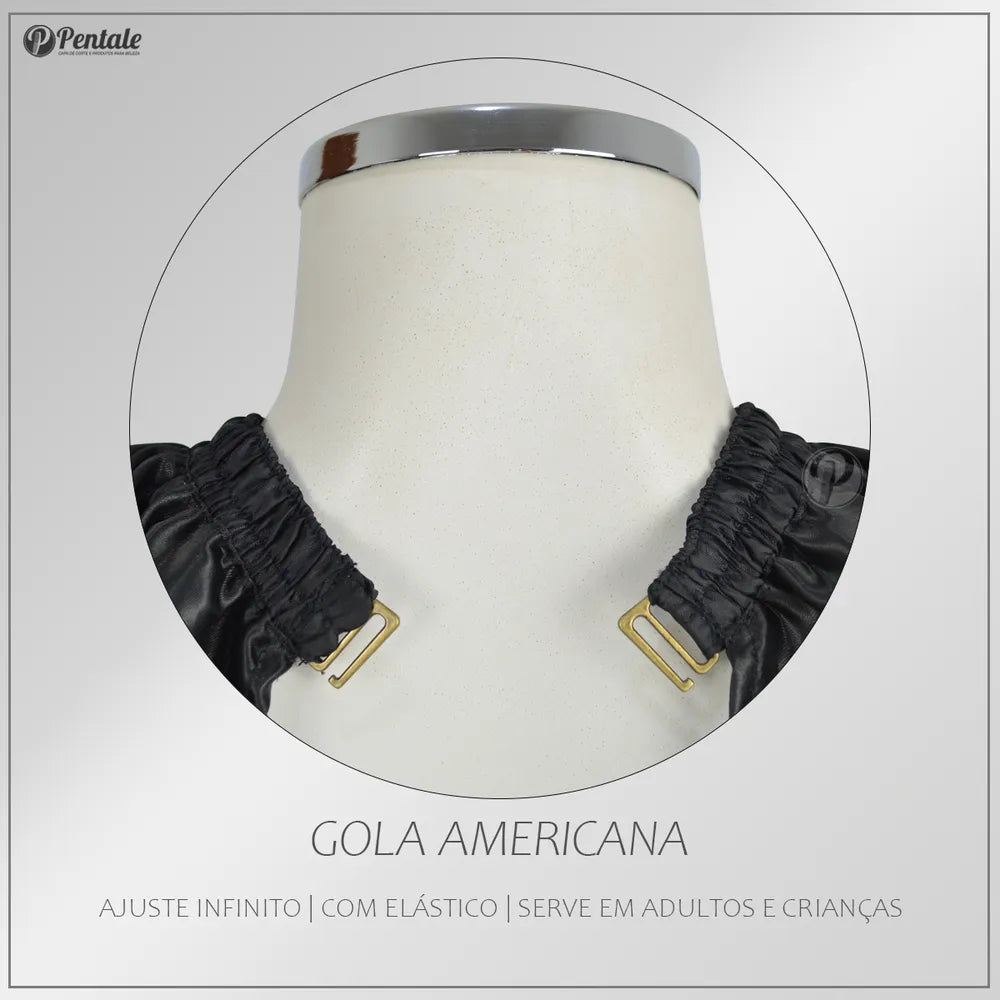 - GOLA AMERICANA / Fechamento com presilhas / Ajuste infinito no pescoço / Serve para crianças e adultos