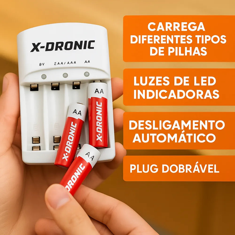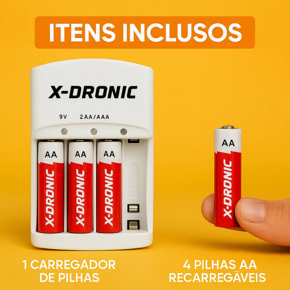 O carregador X-Dronic é perfeito para quem usa pilhas em brinquedos, controles remotos, lanternas, câmeras e outros aparelhos. Ele já vem com 4 pilhas AA recarregáveis de 2600mAh, prontas para o uso.
