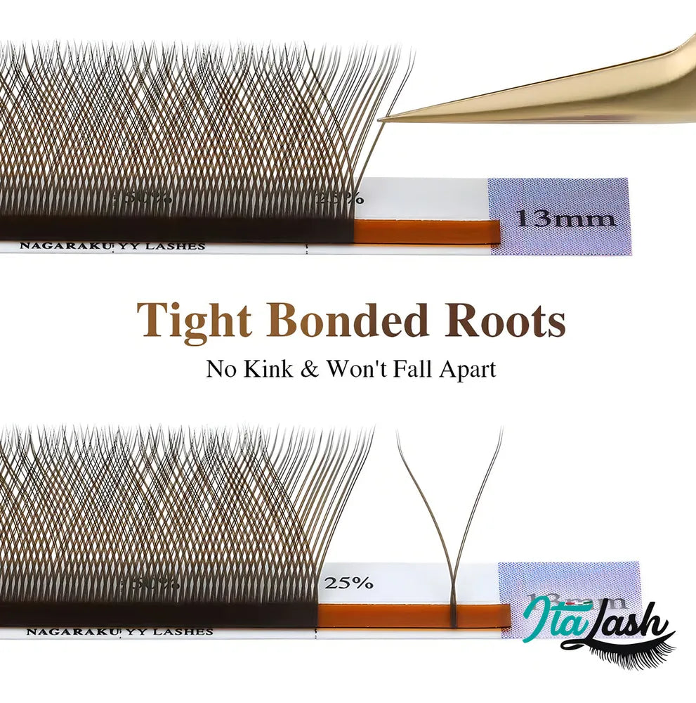 Popularmente conhecidos como Volume Brasileiro, Y style ou fios YY, os cílios em Nagaraku meshy Y-shape são perfeitos para quem adora trabalhar com a técnica clássica, porém quer oferecer algo com um efeito mais volumoso para suas clientes!