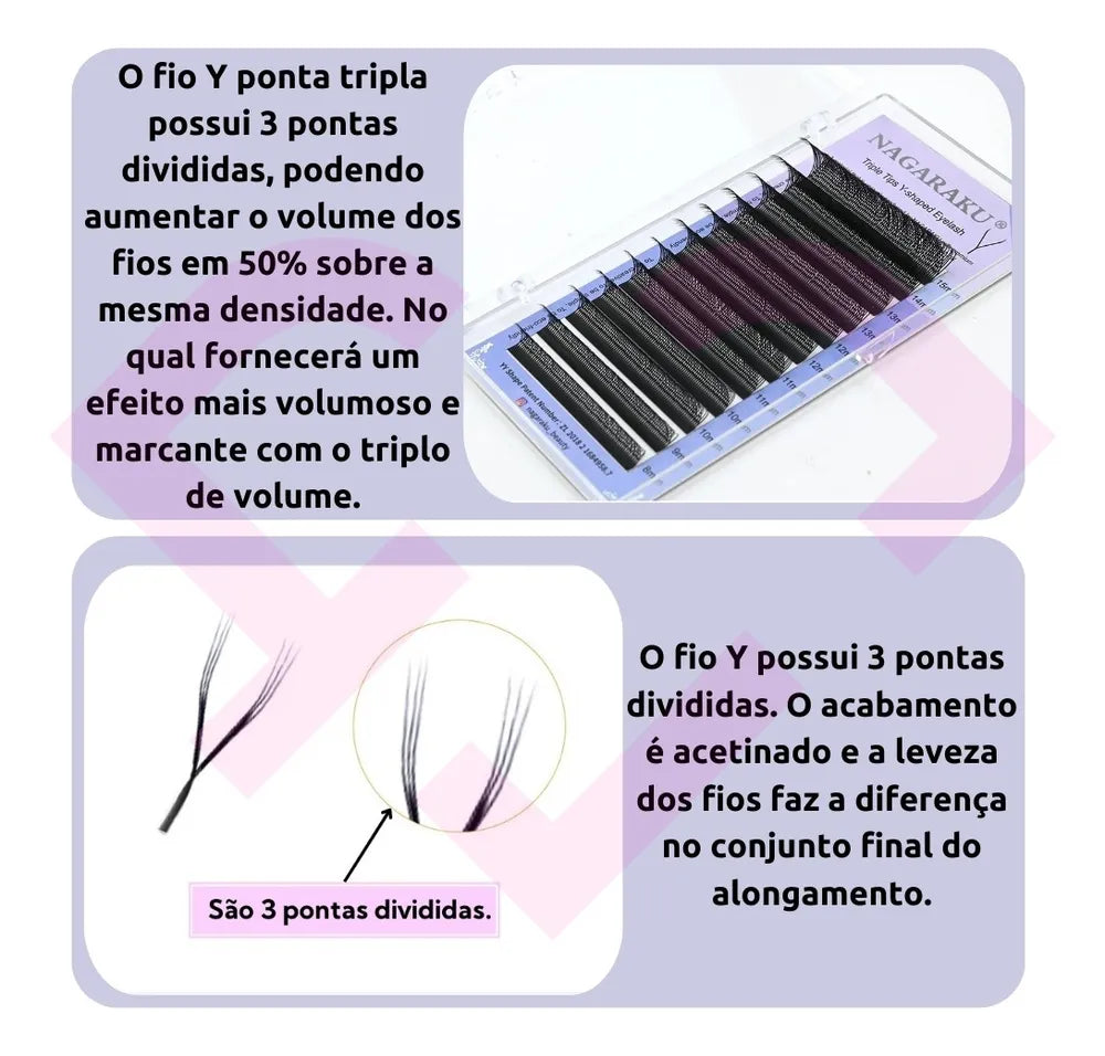 Agora também disponível o fio Y Ponta Tripla, são 3 pontas divididas em forma de y, podendo aumentar o volume de fios em 50% sobre a mesma densidade. Os fios Y ponta tripla irá oferecer um efeito mais volumoso e marcante com o triplo volume de pontas.