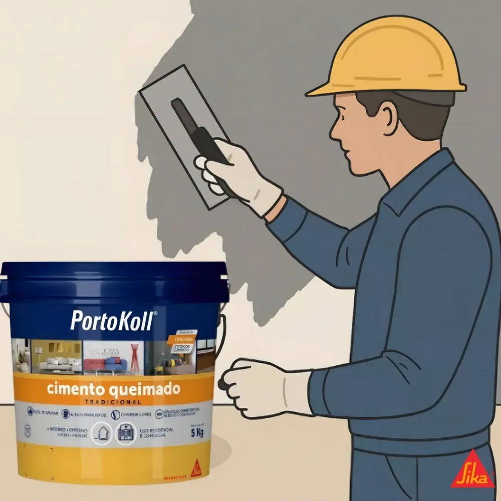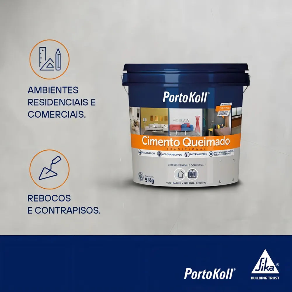 O cimento queimado portokoll é uma argamassa colorida decorativa para o revestimento de pisos e paredes de áreas internas e externas, que proporciona acabamento do tipo cimento queimado tradicional. O produto está disponível em várias cores, as quais devido à sua formulação especial, se mantém estáveis ao longo do tempo.