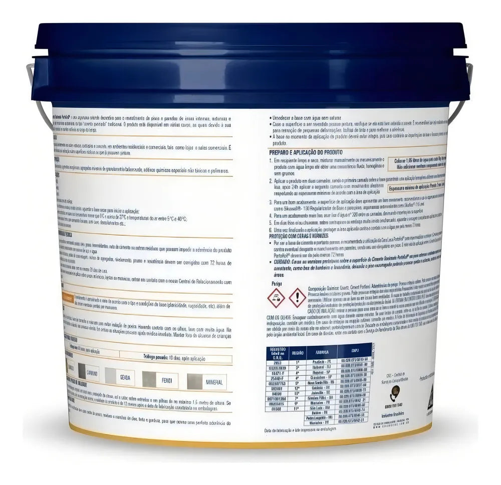 Composição: cimentos especiais, pigmentos inorgânicos, agregados minerais de granulometria balanceada, aditivos químicos especiais não tóxicos e polímeros.