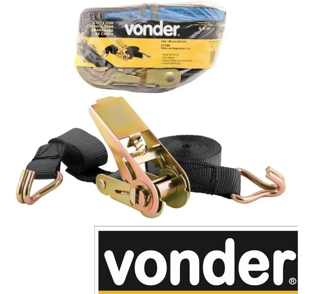 A Cinta Com Catraca Para Amarração de Carga da Vonder é a solução ideal para quem busca segurança e eficiência no transporte de cargas. Com capacidade de suportar até 0,8 tonelada, este produto é essencial para garantir que seus bens cheguem ao destino sem danos. A cinta é feita de poliéster resistente, enquanto os ganchos e a catraca são de aço bicromatizado, oferecendo durabilidade e resistência contra corrosão. O gancho tipo J permite uma ancoragem segura e fácil. Com um comprimento total de 4,6 metros e largura de 25 mm, esta cinta é versátil para diversas aplicações. O fator de segurança de 2:1 assegura que a carga estará sempre protegida. Além disso, o produto vem em uma embalagem prática com suporte plástico, contendo 4 jogos, o que facilita o armazenamento e transporte. A marca Vonder é reconhecida por sua qualidade e confiabilidade, e o modelo 8014250008 reflete essa tradição, sendo uma escolha inteligente para profissionais que não abrem mão da excelência em seus equipamentos de trabalho.