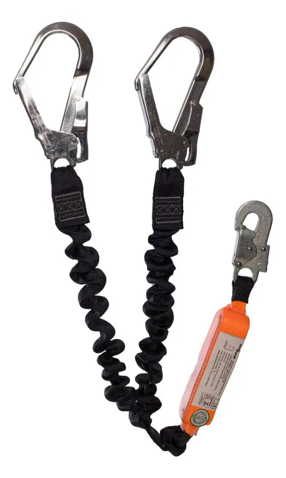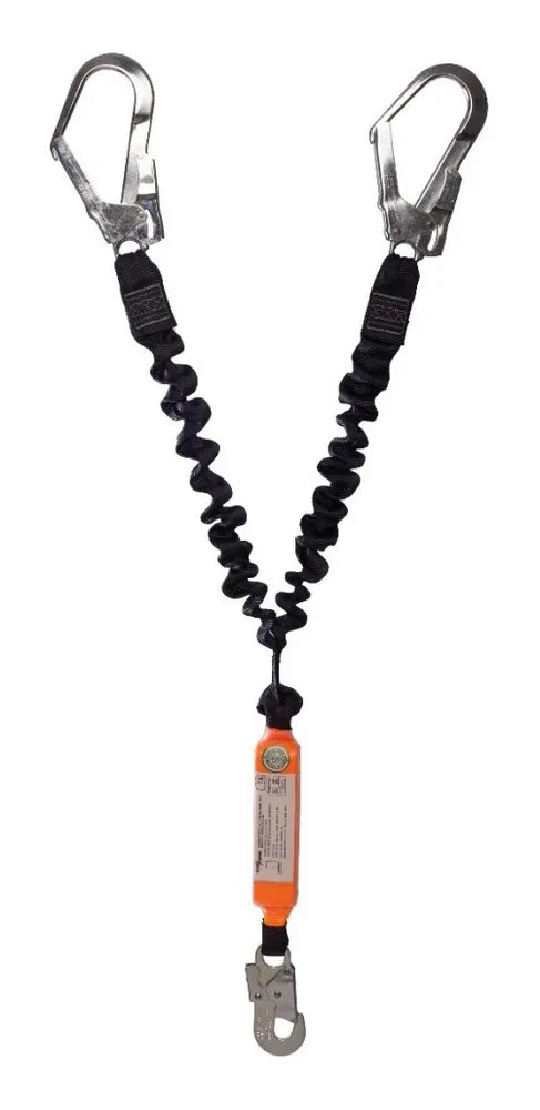 Talabarte duplo com abs, fitas elastizadas, possui um mosquetão abertura 17mm e dois com abertura de 55mm