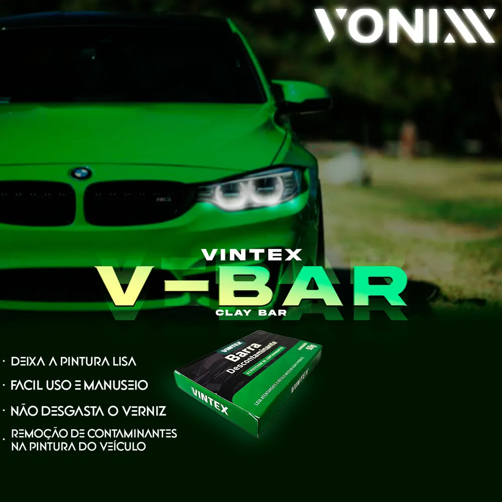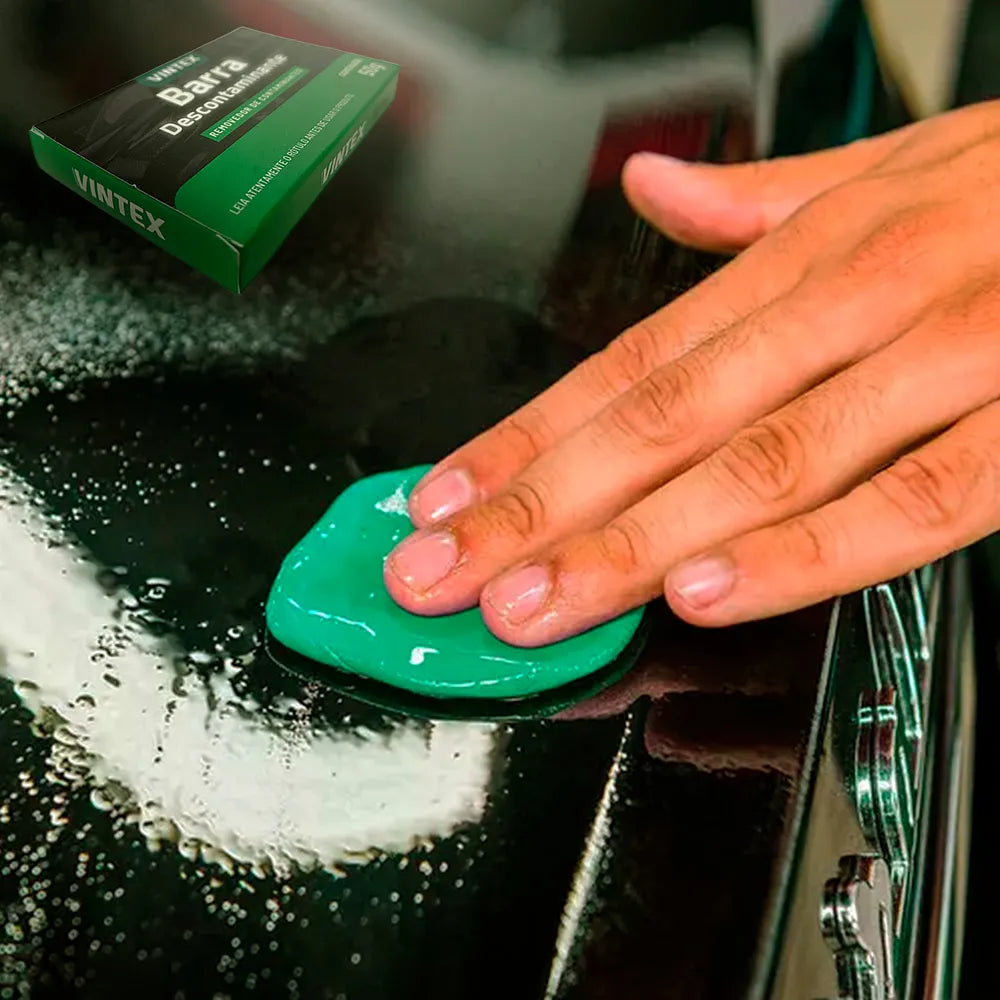 Barra Descontaminante Vintex é um produto desenvolvido especialmente para remoção de contaminantes na pintura do veículo, como pulverização de tintas, seivas de árvores, fezes recentes de pássaros, impactos de insetos, poluição industrial, pó de freio, pigmentos de asfalto e resíduos diversos que danificam a pintura, deixando-a áspera e sem brilho. O produto pode ser utilizado em pintura, vidros, borrachas, cromados e faróis.