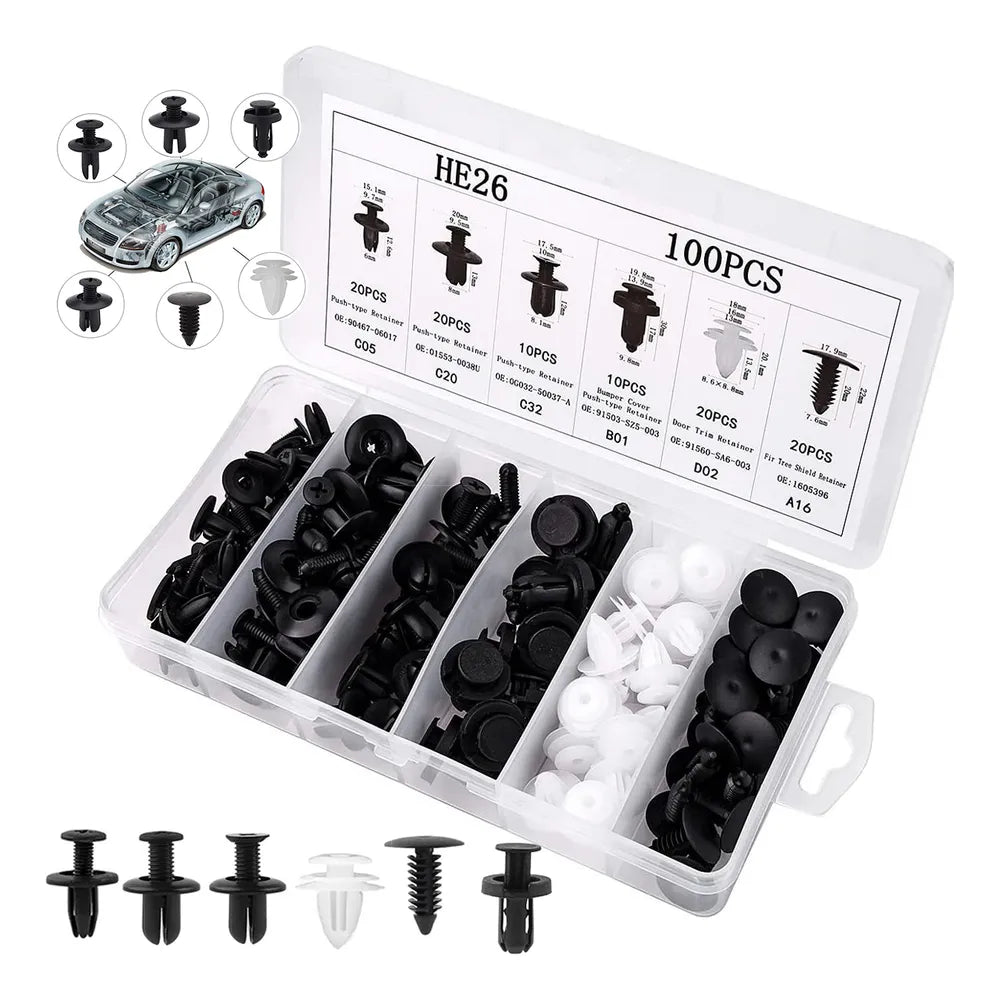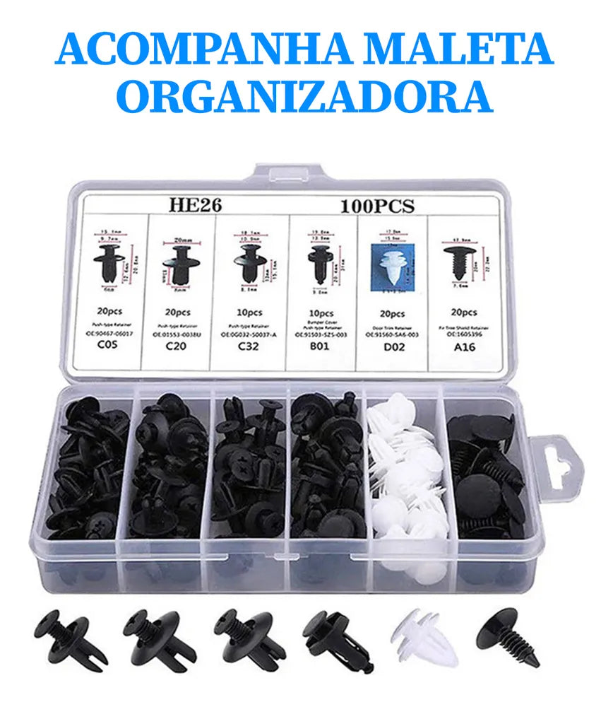 Kit com 100 Presilhas e Grampos Universais para Parabarro e Para-choque com Estojo