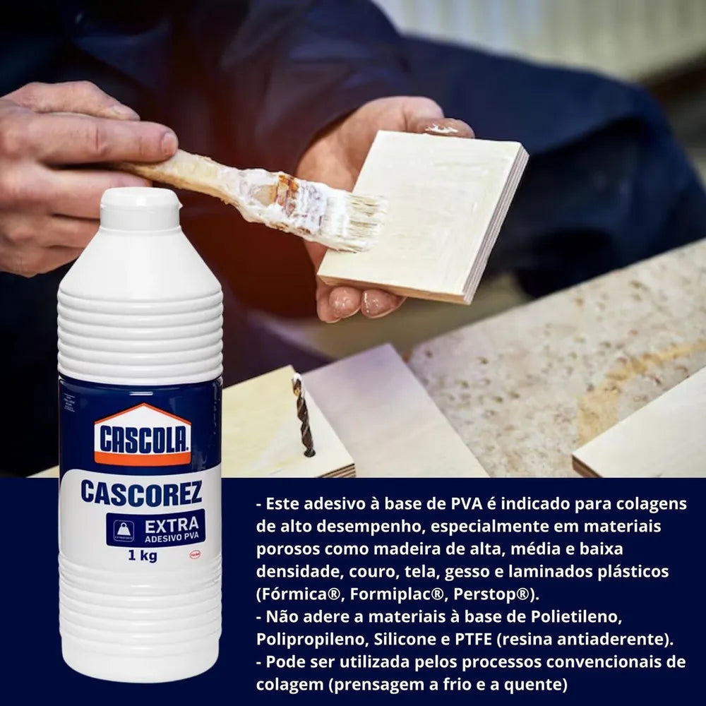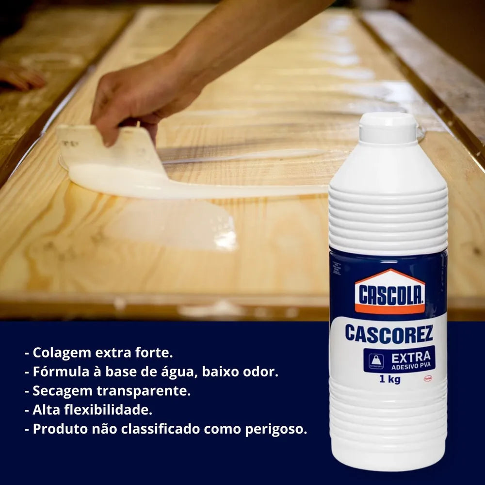 A cola Cacorez Extra PVA é à base de água, isenta de solventes e livre de elementos tóxicos, fornecendo uma colagem resistente e segura.